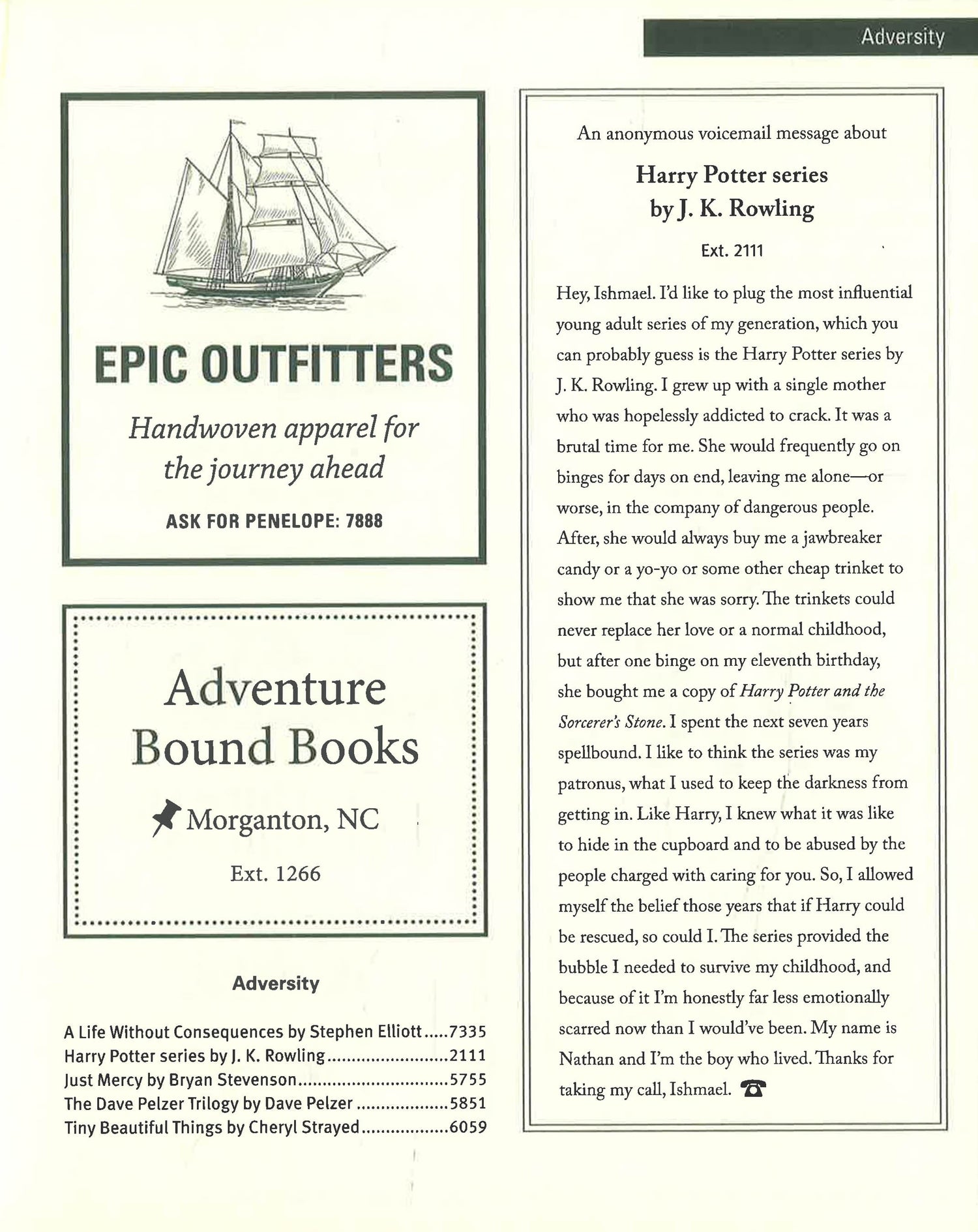 -Heartfelt, anonymous voicemail messages and transcripts from real-life readers sharing unforgettable stories about their most beloved books. You’ll hear how a mother and daughter formed a bond over their love for Erin Morgenstern’s The Night Circus, or how a reader finally felt represented after reading Gene Luen Yang’s American Born Chinese, or how two friends performed Mary Oliver’s Thirst to a grove of trees, or how Anne Frank inspired a young writer to continue journaling.