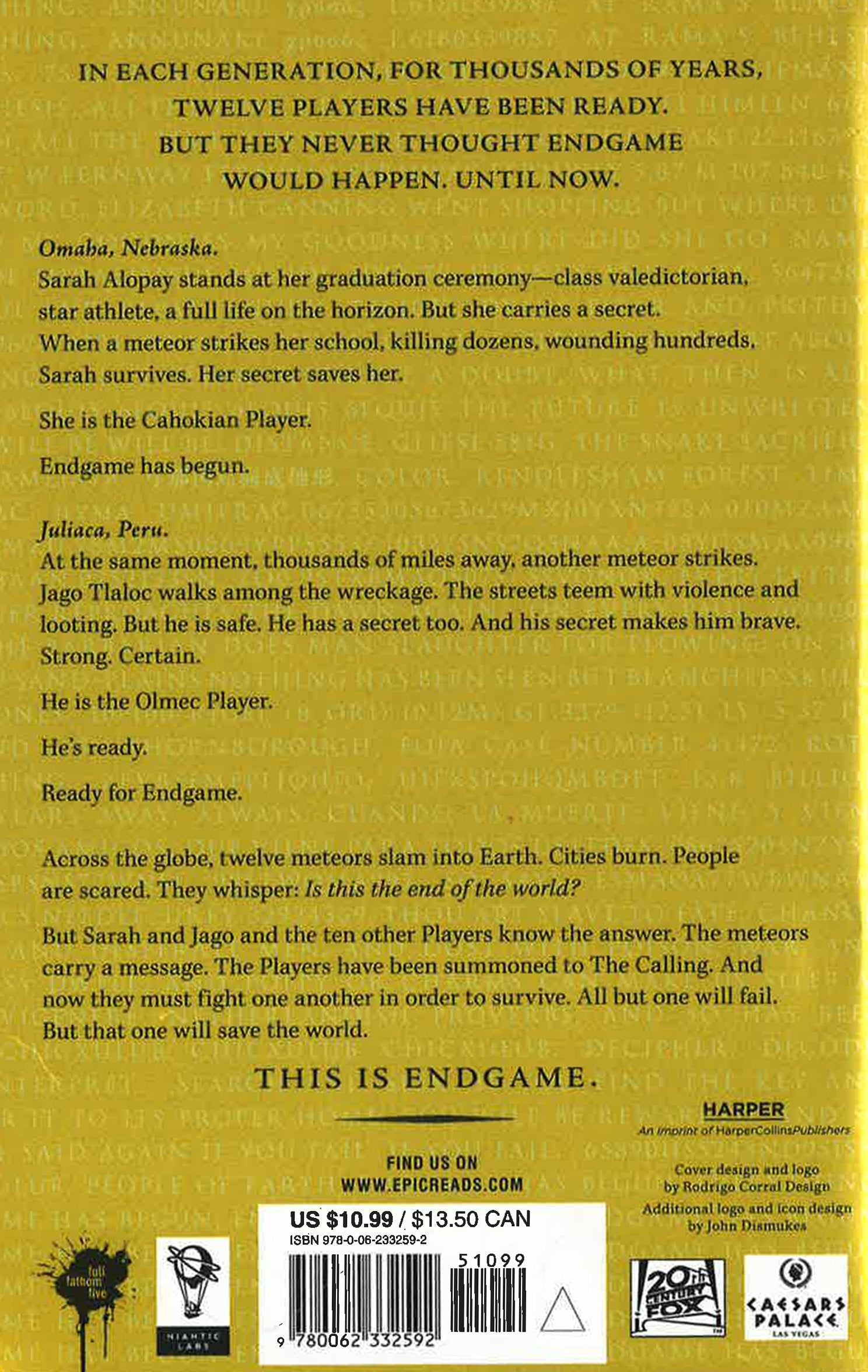 In each generation, for thousands of years, twelve Players have been ready. But they never thought Endgame would happen. Until now.Omaha, Nebraska. Sarah Alopay stands at her graduation ceremony—class valedictorian, star athlete, a full life on the horizon. But when a meteor strikes the school, she survives. Because she is the Cahokian Player. Endgame has begun.Juliaca, Peru. At the same moment, thousands of miles away, another meteor strikes. But Jago Tlaloc is safe. He has a secret, and his secret makes him brave. Strong. Certain. He is the Olmec Player. He's ready. Ready for Endgame.Across the globe, twelve meteors slam into Earth. Cities burn. But Sarah and Jago and the ten others Players know the truth. The meteors carry a message. The Players have been summoned to The Calling. And now they must fight one another in order to survive. All but one will fail. But that one will save the world. This is Endgame.