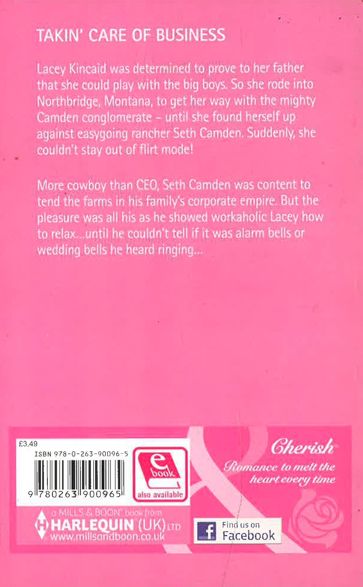 More cowboy than CEO, Seth Camden was content to tend the farms in his family's corporate empire. But the pleasure was all his as he showed workaholic Lacey how to relax… until he couldn't tell if it was alarm bells or wedding bells he heard ringing…
