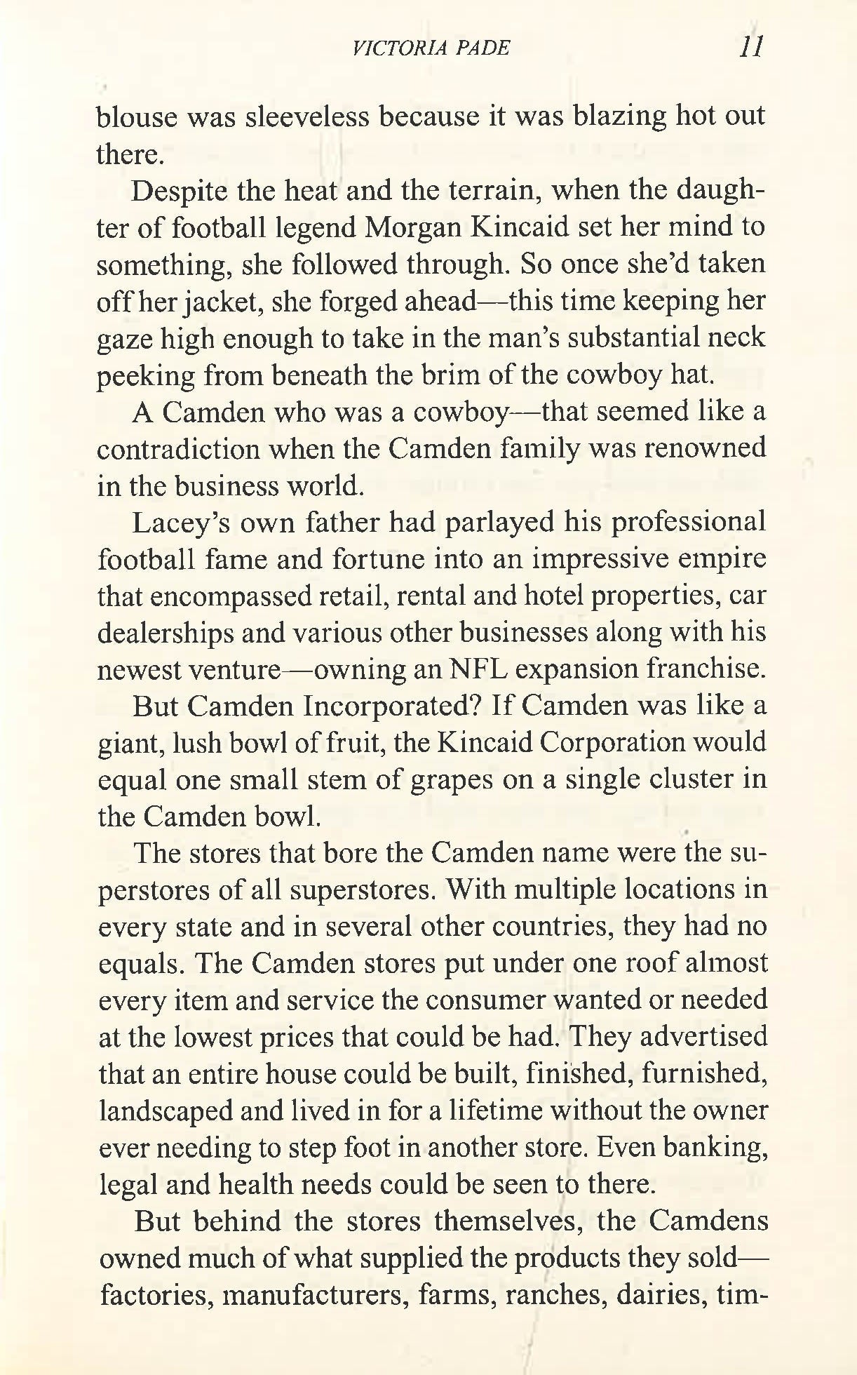 Lacey Kincaid was determined to prove to her father that she could play with the big boys. So she rode into Northbridge, Montana, to get her way with the mighty Camden conglomerate - until she found herself up against easygoing rancher Seth Camden. Suddenly, she couldn't stay out of flirt mode!