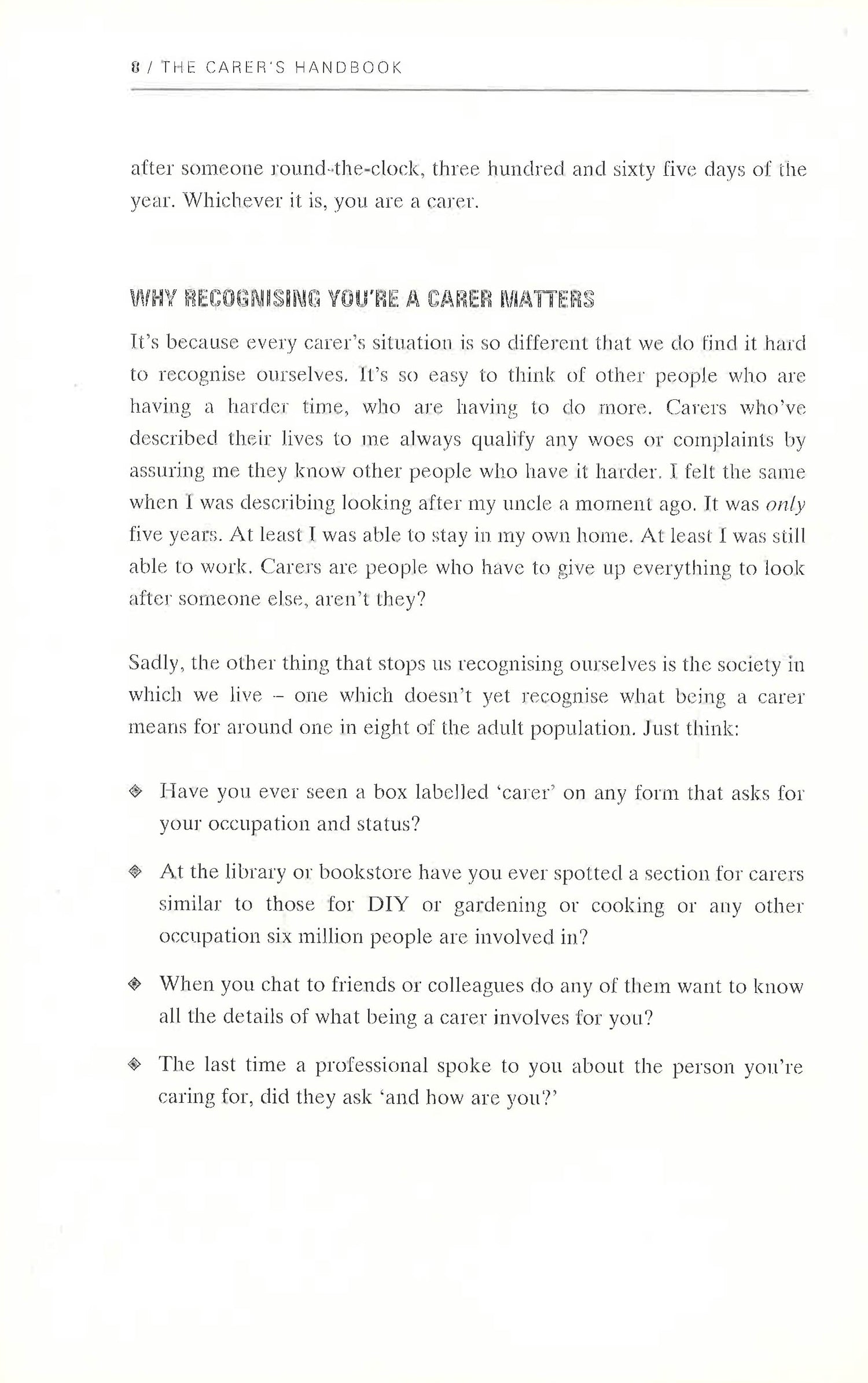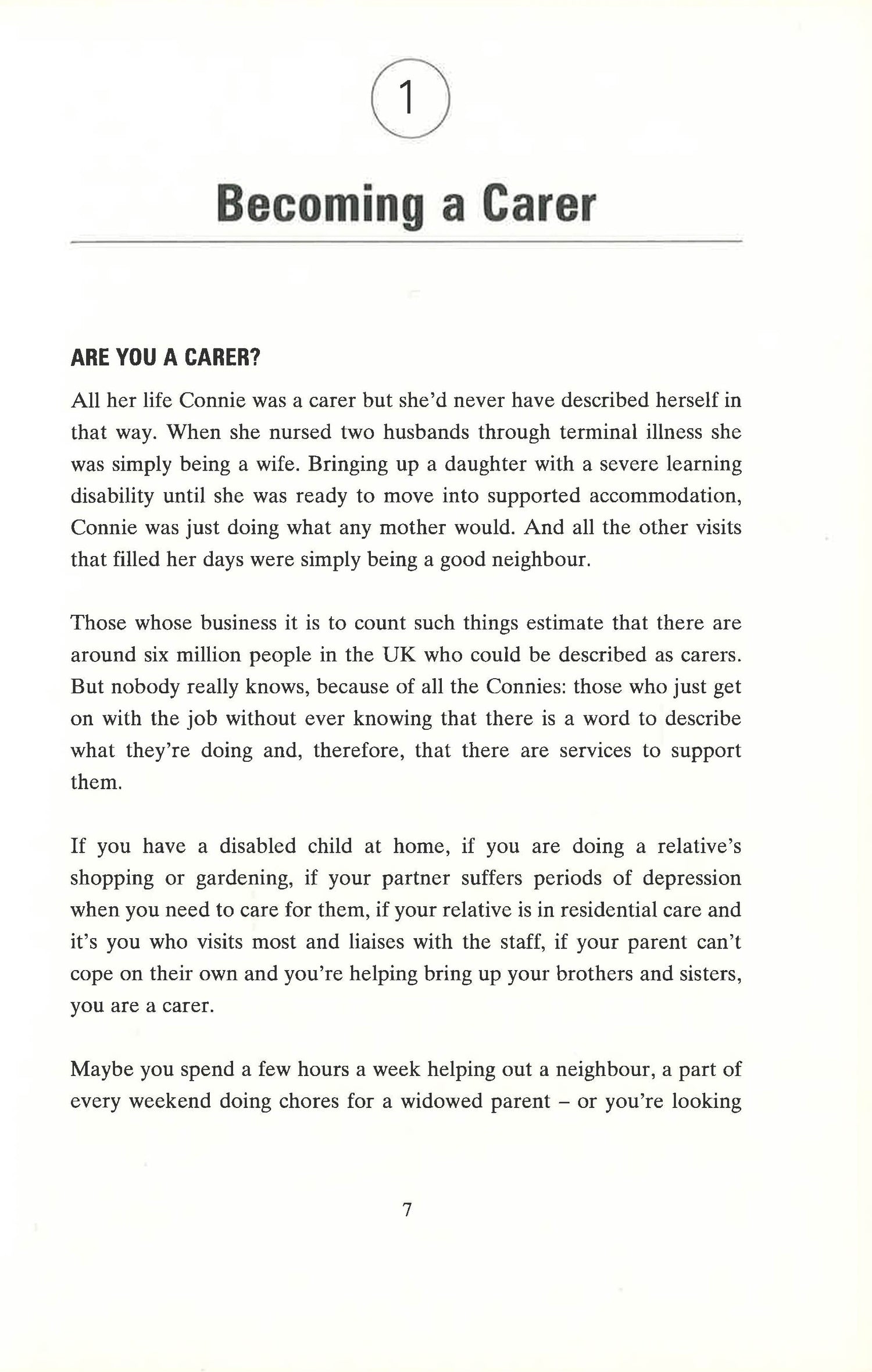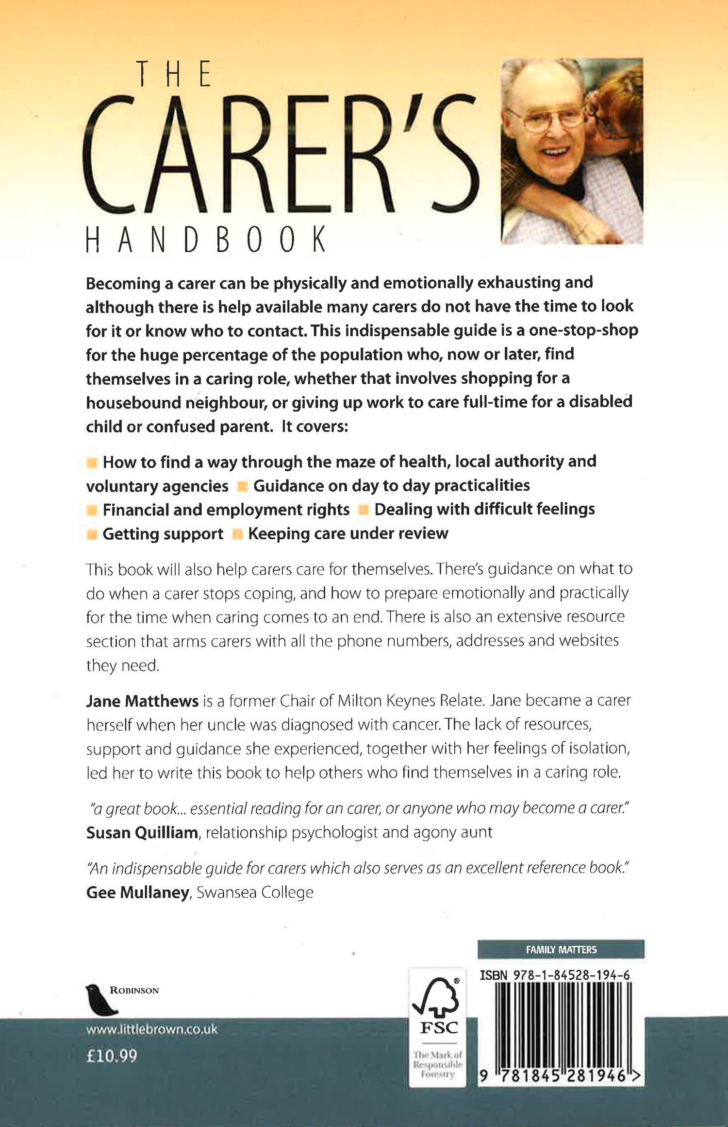 Becoming a carer can be a physically and emotionally exhausting task and although there is help available many carers do not have the time to look for it or know who to contact. This indispensable guide aims to be a one-stop-shop for the huge percentage of the population who, now or later, find themselves in a caring role, whether that involves shopping for a housebound neighbour, or giving up work to care full-time for a disabled child or confused parent. This book will also help carers care for themselves. It looks at the difficult feelings that go hand in hand with caring, including how relationships are affected. There's guidance on what to do when a carer stops coping, and how to prepare emotionally and practically for the time when caring comes to an end. There is also an extensive resource section that arms carers with all the phone numbers, addresses and websites they need.
