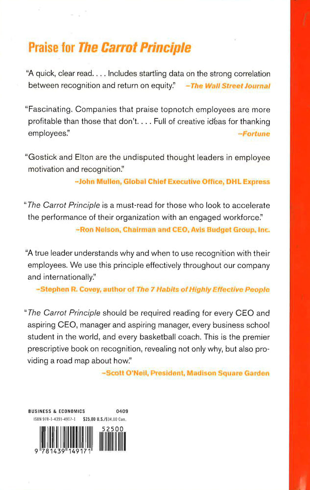 Got carrotphobia? Do you think that recognizing your employees will distract you and your team from more serious business, create jealousy, or make you look soft? Think again. The Carrot Principle reveals the groundbreaking results of one of the most in-depth management studies ever undertaken, showing definitively that the central characteristic of the most successful managers is that they provide their employees with frequent and effective recognition. With independent research from The Jackson Organization and analysis by bestselling leadership experts Adrian Gostick and Chester Elton, this breakthrough study of 200,000 people over ten years found dramatically greater business results when managers offered constructive praise and meaningful rewards in ways that powerfully motivated employees to excel.