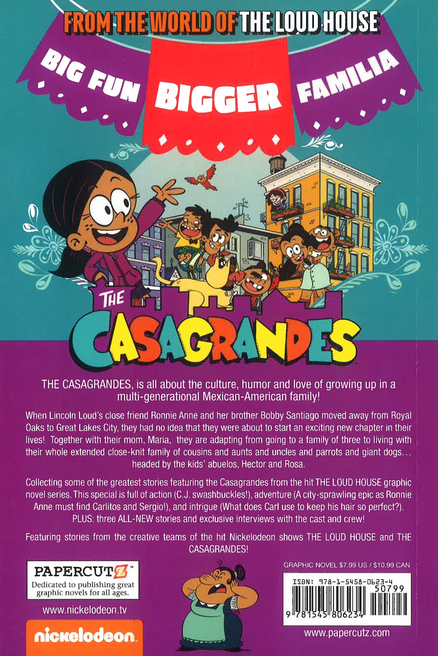 When Lincoln Loud’s close friend Ronnie Anne and her brother Bobby Santiago moved away from Royal Oaks to the Big City, they had no idea that they were about to start an exciting new chapter in their lives, while living in an apartment above their abuelo’s Mercado. Together with their mom, Maria, they are adapting from going to a family of three in Royal Oaks to living with their whole extended family, headed by the kids’ abuelos, Hector and Rosa, in the big city. Now, The Casagrandes are starring in their own popular animated series on Nickelodeon! Collecting The Casagrandes’s greatest comic stories from the hit The Loud House graphic novel series. Featuring stories from the creative team of the hit Nickelodeon shows The Loud House and The Casagrandes!