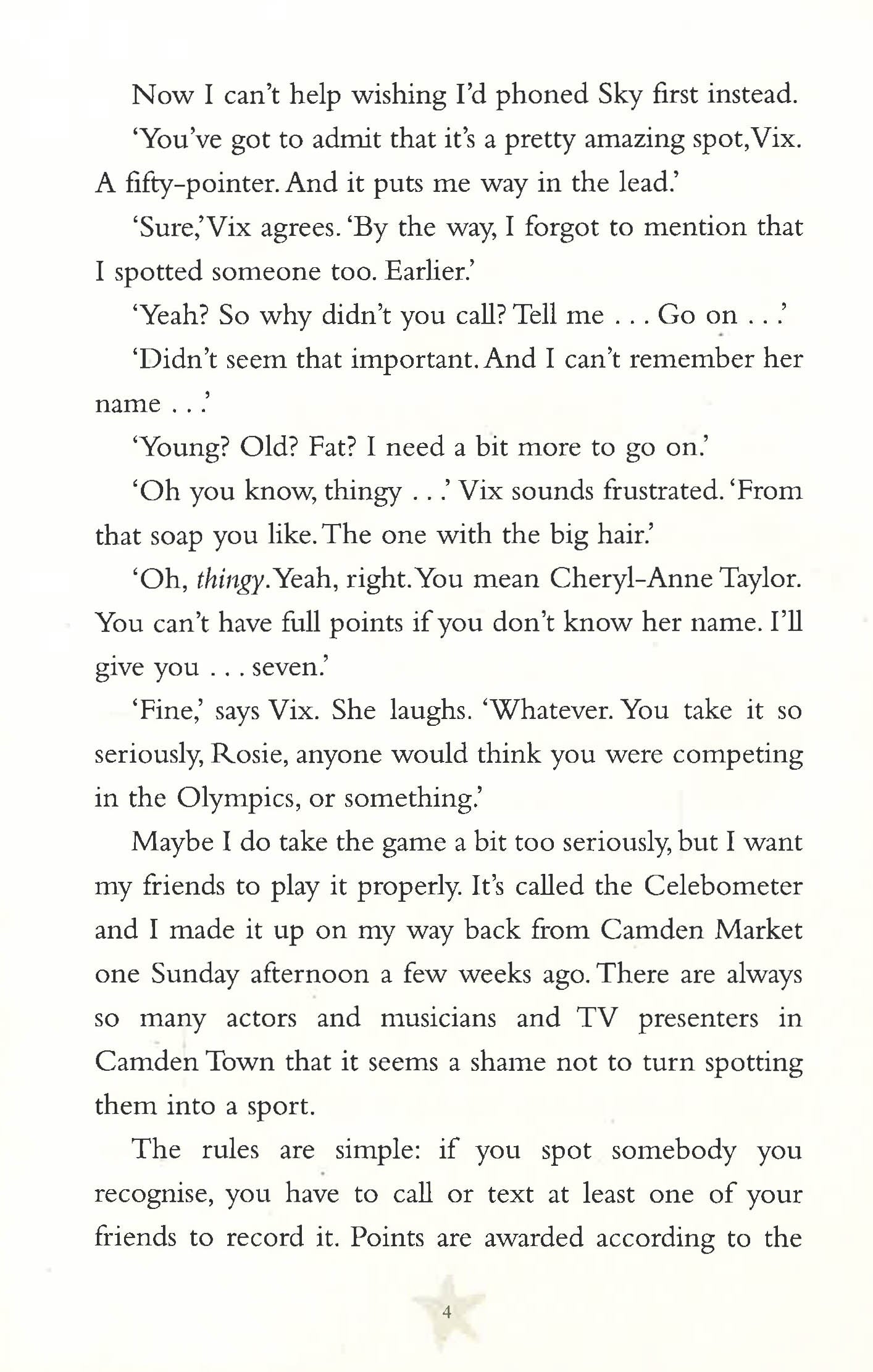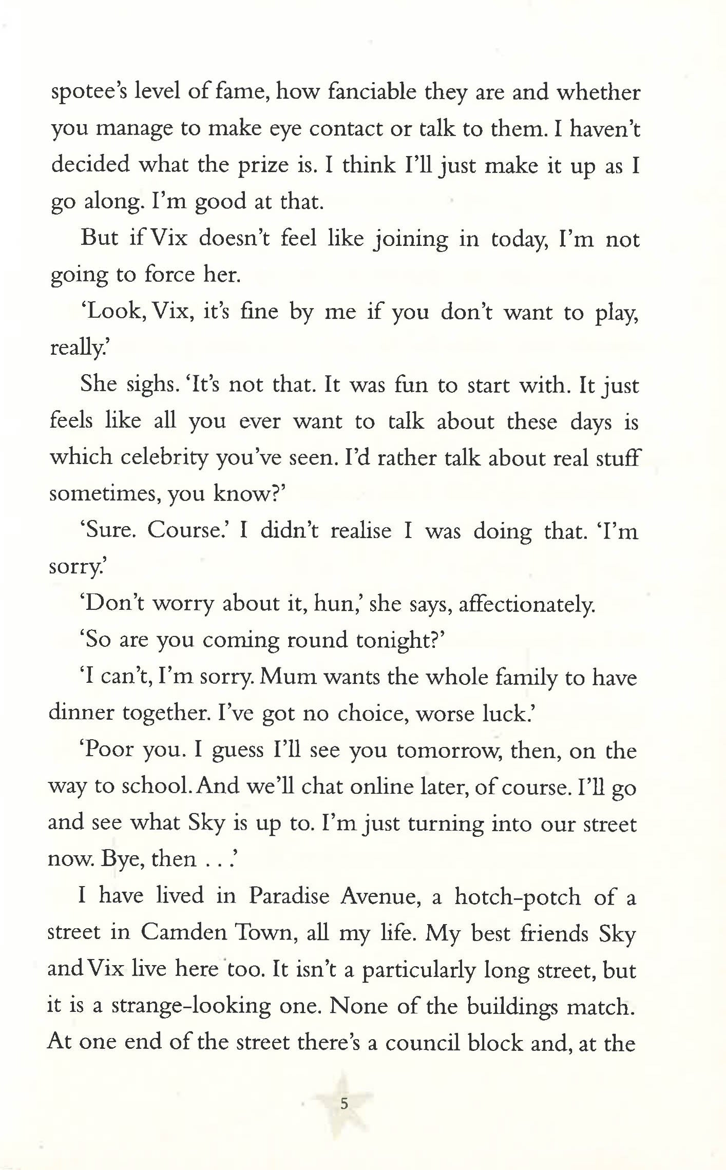 Friends, fun and fame in amazing Camden Town! Rosie Buttery has lived in Paradise Avenue in Camden Town all her life. Her mother is a GP at the local doctors' surgery, her dad is a frustrated artist, and her brother . . . well, he's just a pain. Living in Camden Town is great. Not only do Rosie and her best friends, Sky and Vix have the market to hang out at and gigs to go to, there are also celebrities to spot, and TV studios, where they might just get noticed. When Rosie finds out that the drummer from a chart-topping group is moving in to the big house at the end of her street, she makes it her mission to befriend him. But things don't work out quite the way she expected.