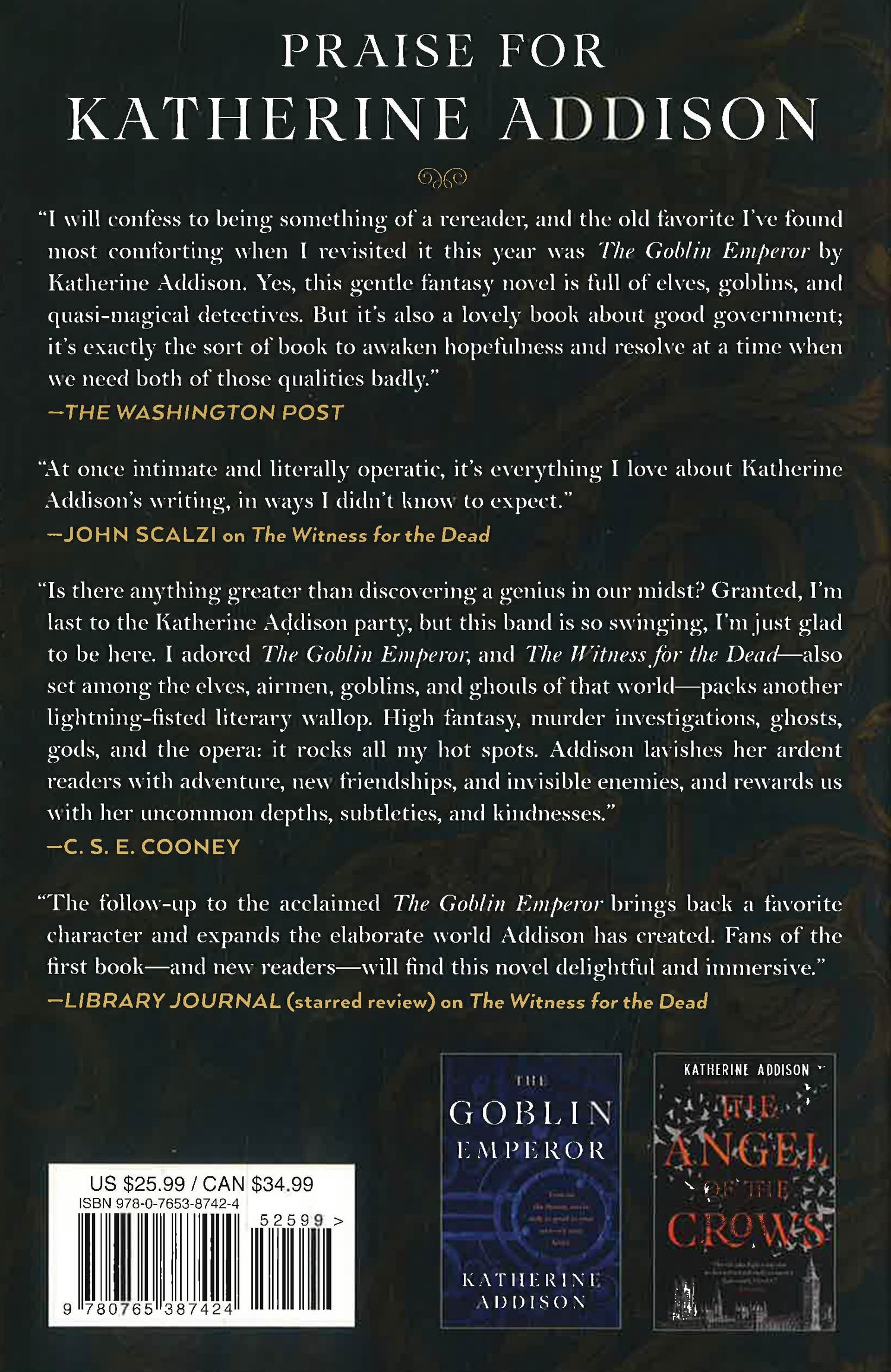 When the young half-goblin emperor Maia sought to learn who had set the bombs that killed his father and half-brothers, he turned to an obscure resident of his father’s Court, a Prelate of Ulis and a Witness for the Dead. Thara Celehar found the truth, though it did him no good to discover it. He lost his place as a retainer of his cousin the former Empress, and made far too many enemies among the many factions vying for power in the new Court. The favor of the Emperor is a dangerous coin.