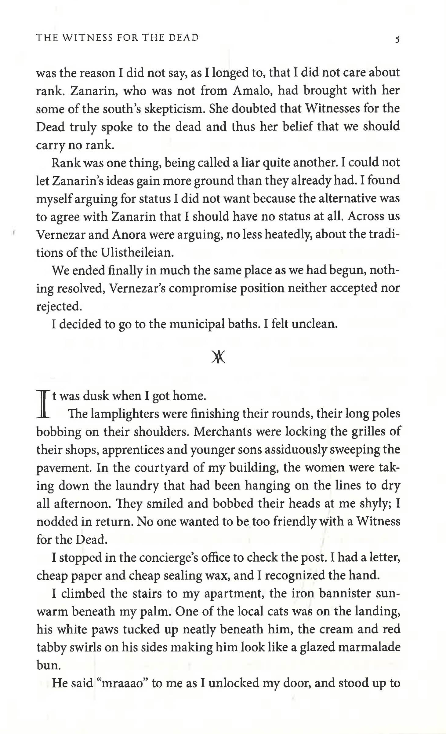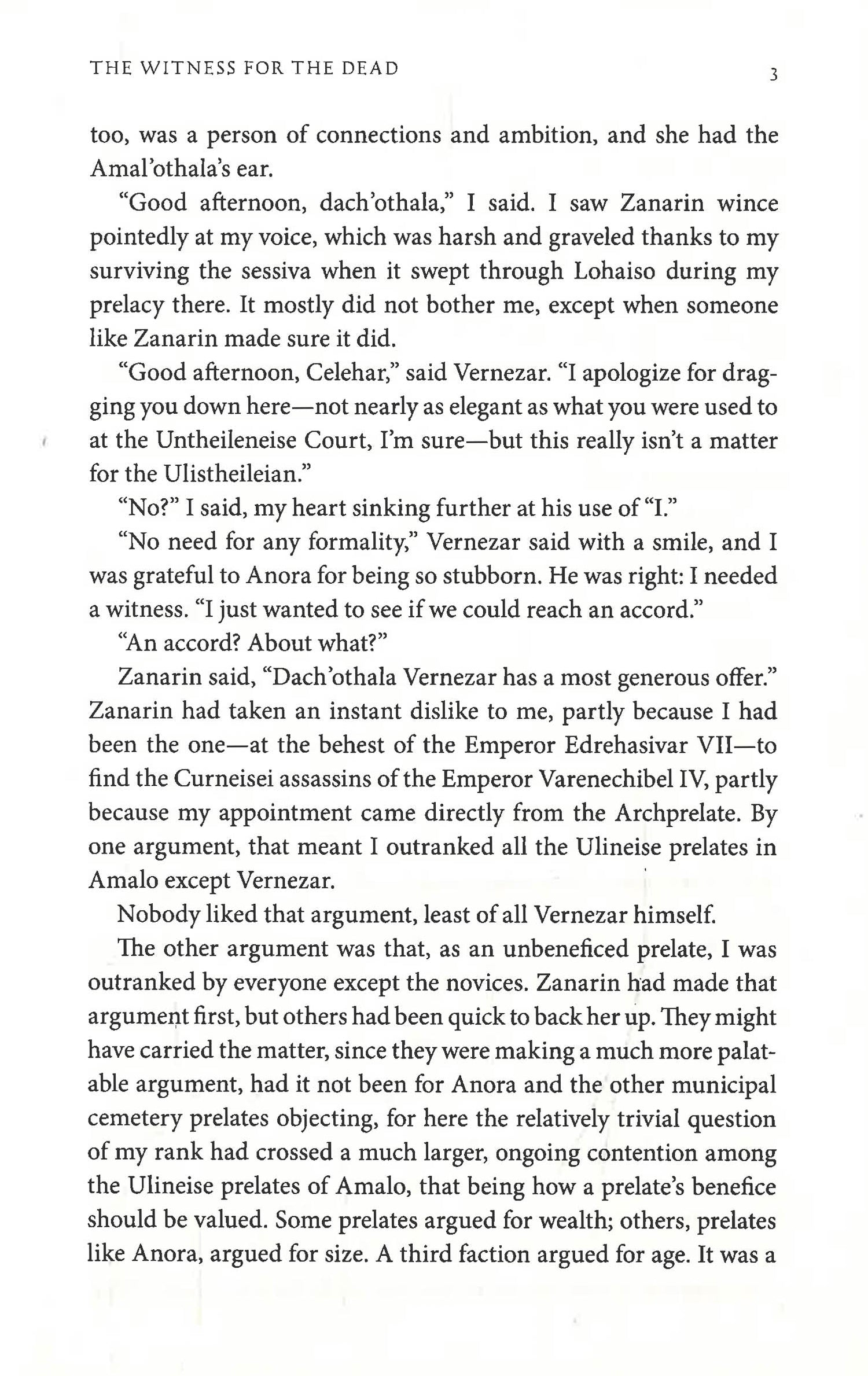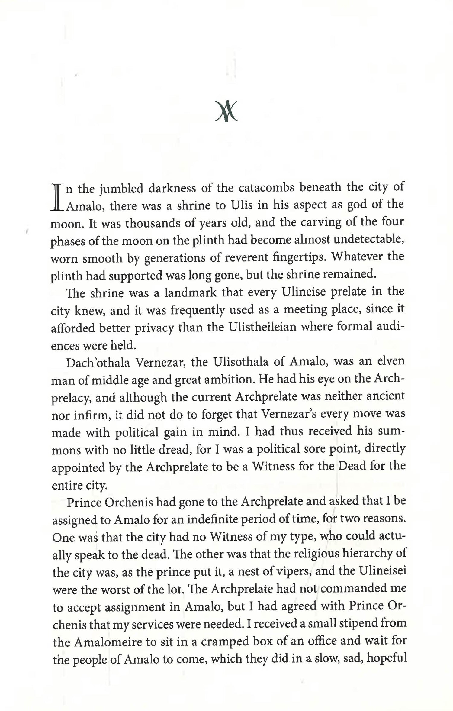 Now Celehar lives in the city of Amalo, far from the Court though not exactly in exile. He has not escaped from politics, but his position gives him the ability to serve the common people of the city, which is his preference. He lives modestly, but his decency and fundamental honesty will not permit him to live quietly. As a Witness for the Dead, he can, sometimes, speak to the recently dead: see the last thing they saw, know the last thought they had, experience the last thing they felt. It is his duty use that ability to resolve disputes, to ascertain the intent of the dead, to find the killers of the murdered.