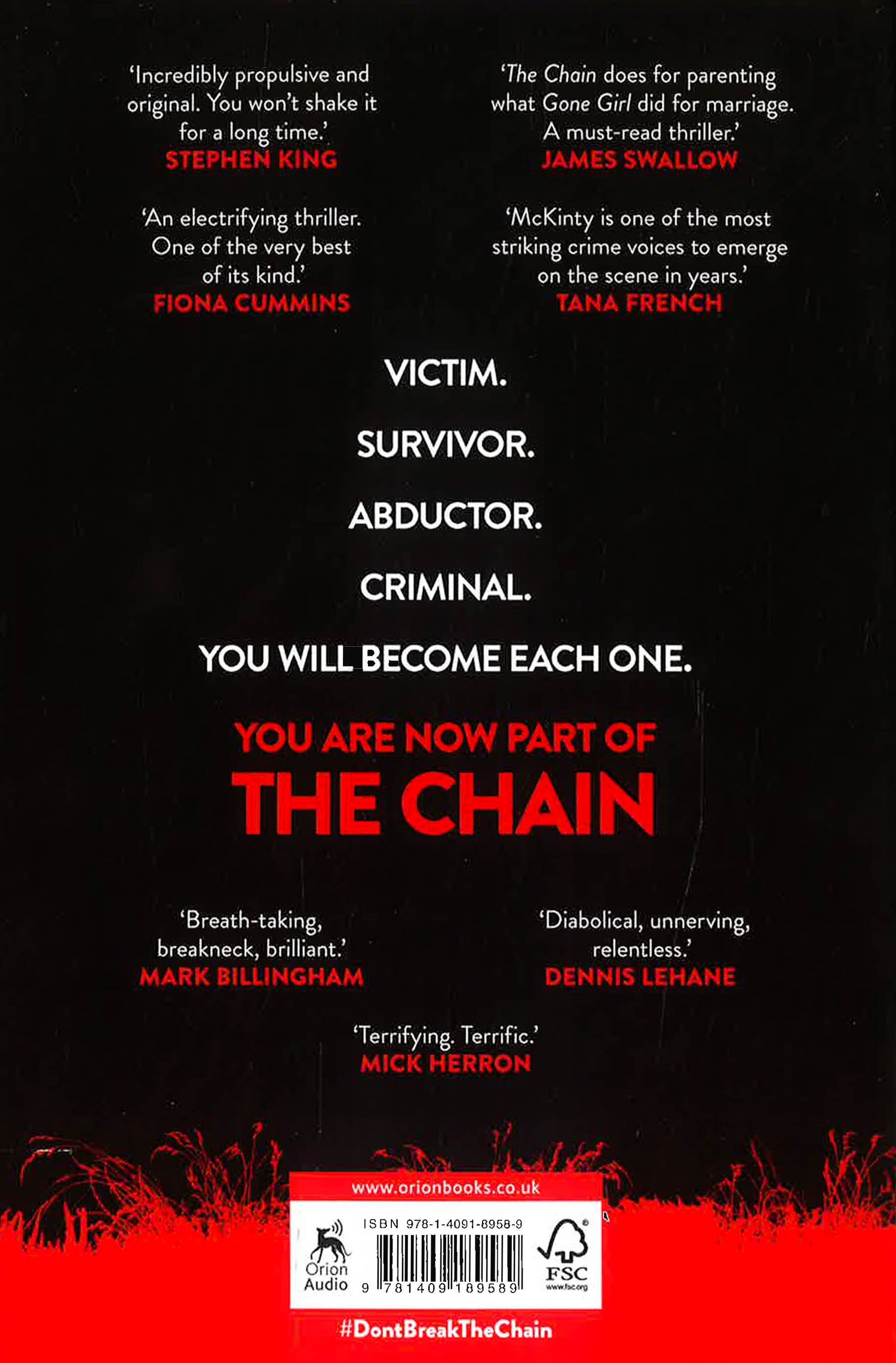 VICTIM.SURVIVOR.ABDUCTOR.CRIMINAL.YOU WILL BECOME EACH ONE.YOUR PHONE RINGS.A STRANGER HAS KIDNAPPED YOUR CHILD.TO FREE THEM YOU MUST ABDUCT SOMEONE ELSE'S CHILD.YOUR CHILD WILL BE RELEASED WHEN YOUR VICTIM'S PARENTS KIDNAP ANOTHER CHILD.IF ANY OF THESE THINGS DON'T HAPPEN:YOUR CHILD WILL BE KILLED.YOU ARE NOW PART OF THE CHAIN.