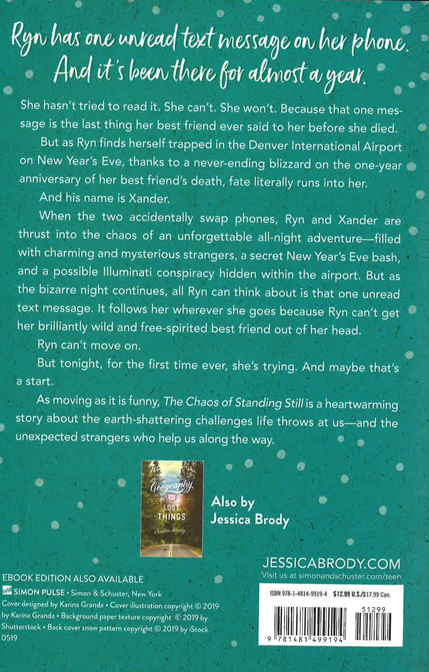"I fell hard for this story of love, loss, friendship, and bad airport food. I loved it!" --Morgan Matson, New York Times bestselling author of The Unexpected Everything Over the course of one chaotic night stranded at the Denver airport, Ryn confronts her shattered past thanks to the charm of romance, the uniqueness of strangers, and the magic of ordinary places in this "laugh-out-loud funny, deeply stirring" (Julie Buxbaum, New York Times bestselling author of Tell Me Three Things) novel from the author of Boys of Summer. Ryn has one unread text message on her phone. And it's been there for almost a year. She hasn't tried to read it. She can't. She won't. Because that one message is the last thing her best friend ever said to her before she died. But as Ryn finds herself trapped in the Denver International Airport on New Year's Eve thanks to a never-ending blizzard on the one-year anniversary of her best friend's death, fate literally runs into her. And his name is Xander. When the two accidentally swap phones, Ryn and Xander are thrust into the chaos of an unforgettable all-night adventure, filled with charming and mysterious strangers, a secret New Year's Eve bash, and a possible Illuminati conspiracy hidden within the Denver airport. But as the bizarre night continues, all Ryn can think about is that one unread text message. It follows her wherever she goes, because Ryn can't get her brilliantly wild and free-spirited best friend out of her head. Ryn can't move on. But tonight, for the first time ever, she's trying. And maybe that's a start. As moving as it is funny, The Chaos of Standing Still is a heartwarming story about the earth-shattering challenges life throws at us--and the unexpected strangers who help us along the way.
