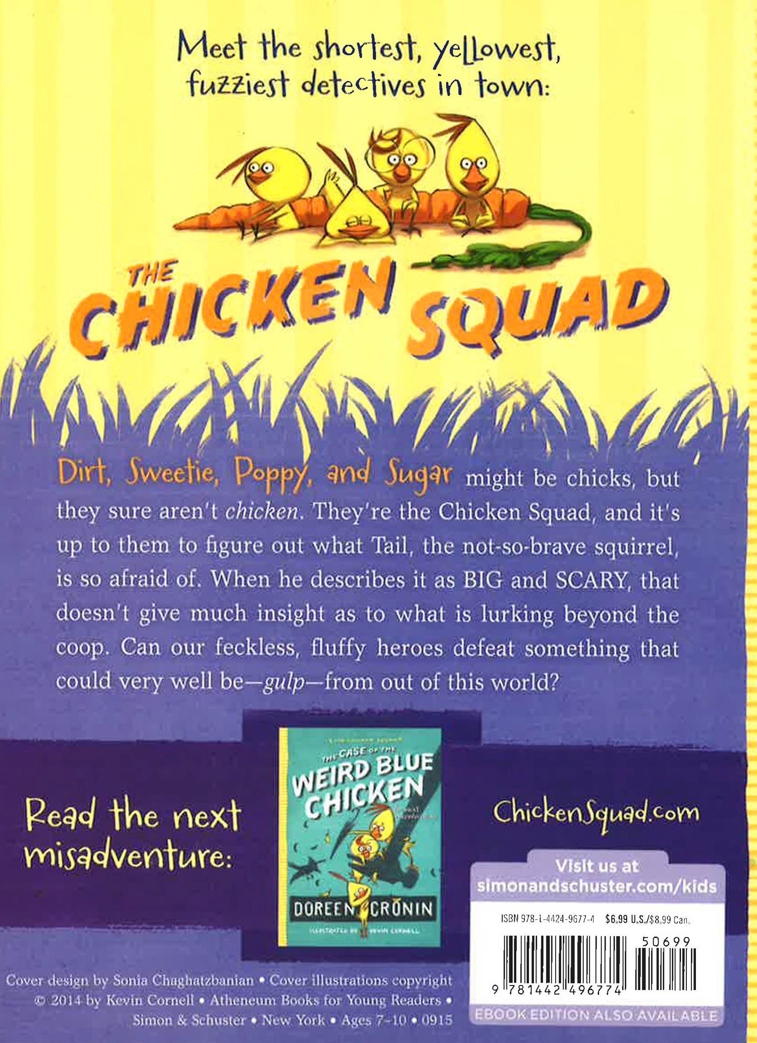 They might be chicks, but they sure arent chicken, and theyre on a mission. And on this, their first (mis)adventure in this delightful spinoff of the J.J. Tully series (Kirkus Reviews), the Chicken Squad launches a galactic backyard expedition. Meet the Chicken Squad: Dirt, Sugar, Poppy, and Sweetie. These chicks are not your typical barnyard puffs of fluff, and they are not about to spend their days pecking chicken feed and chasing bugs. No sir, theyre too busy solving mysteries and fighting crime. So when Squirrel comes barreling into the chicken coop, the chicks know theyre about to get a case. But with his poor knowledge of shapes (Big is not a shape, Squirrel!) and utter fear of whatever it is thats out there, the panicky Squirrel is NO HELP. Good thing these chicks are professionals. But even professionals get worried. Especially once they see that round, shiny, green, BIG thing in the yard. What if its a UFO full of aliens who want chickens as pets, or worse, dinner? Its up to the Chicken Squad to crack a case that just might be out of this world.
