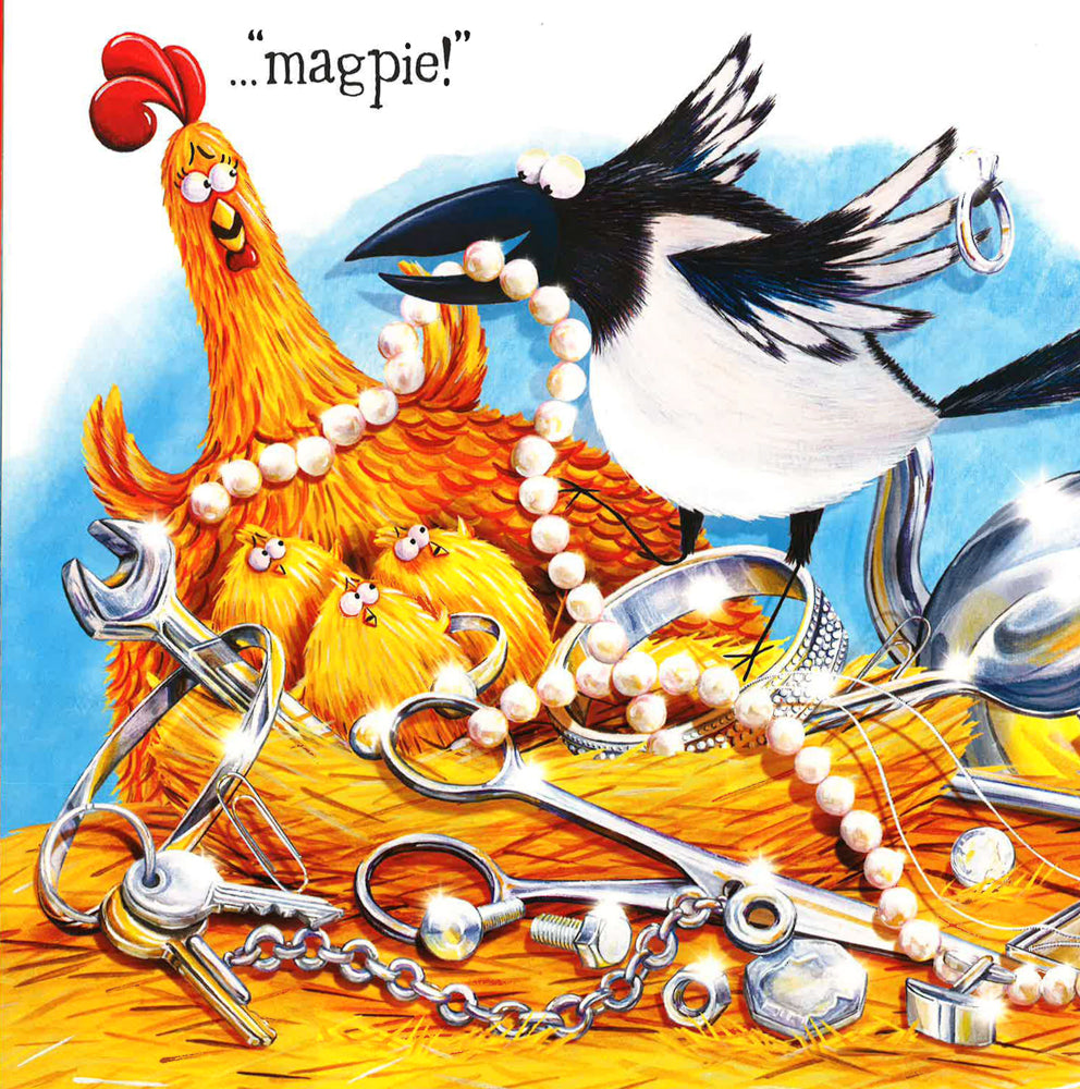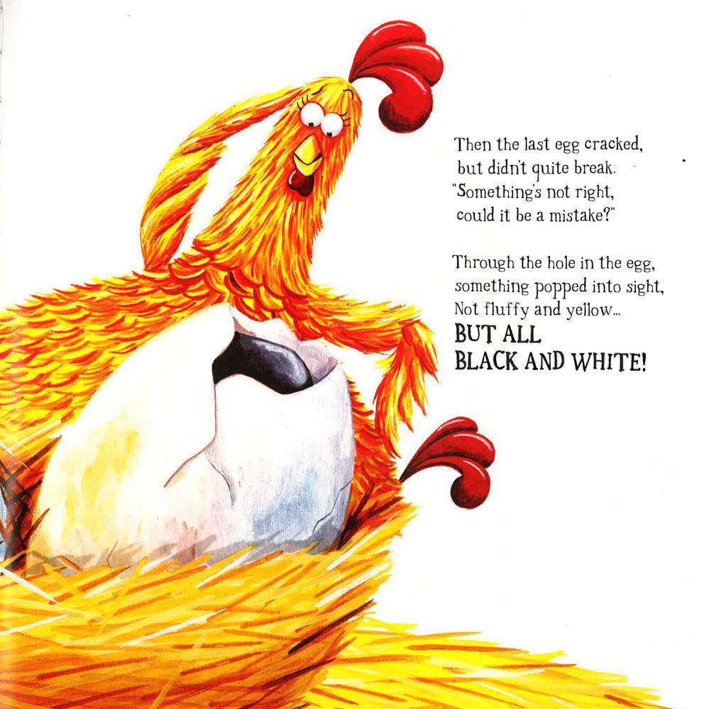 When three yellow chicks hatch from Mrs. Chicken's eggs, all seems fine. But when the last egg cracks to reveal something black and white, the barn is thrown into chaos as the most imaginative guessing game begins! Join a host of farm animals in an eccentric tale of discovery to find the answer to the big question in the barn can a chicken really hatch a cow? (or a skunk, or a whale..?) A light-hearted book exploring individuality through the diverse world of black and white animals.