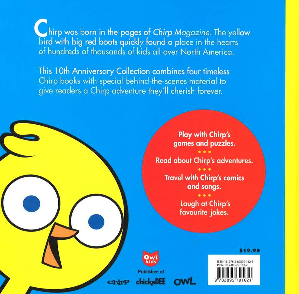Ten years ago, Chirp was hatched on the pages of Chirp Magazine; since then, hundreds of thousands of children have fallen head-over-boots for this lovable character. The special 10th anniversary hardcover edition features four books and special bonus material. Laugh with Chirp, Read with Chirp, Play with Chirp and Travel with Chirp. It contains the first ever Chirp comic and gives a behind-the-scenes look at the illustrators studio where he gives a lesson on how to draw Chirp.