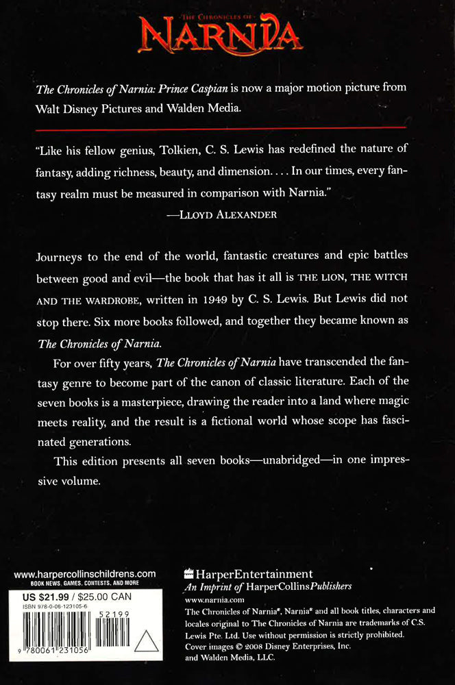 For over fifty years, The Chronicles of Narnia have transcended the fantasy genre to become part of the canon of classic literature. Each of the seven books is a masterpiece, drawing the reader into a land where magic meets reality, and the result is a fictional world whose scope has fascinated generations.