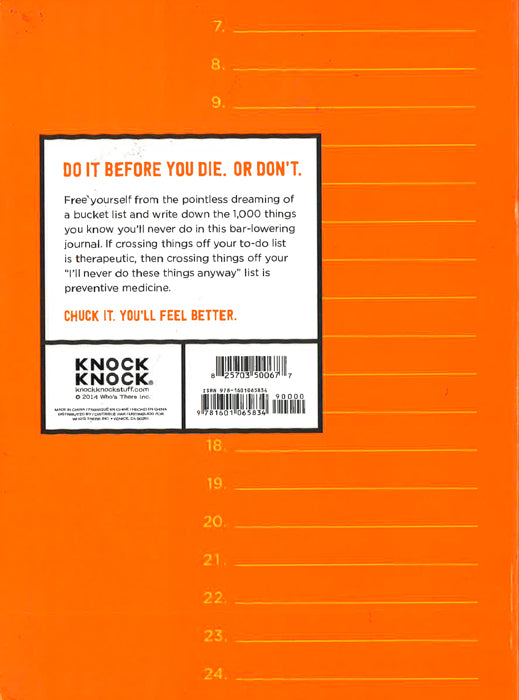 The opposite of a bucket list, this real-life-affirming journal celebrates not doing a bunch of stressful, demanding activities (base-jumping, eating fugu, etc.) before you check out. Contains humorous prompts and facts on things you'll never try. The Chuck It List offers the same content--with a curse-free title!