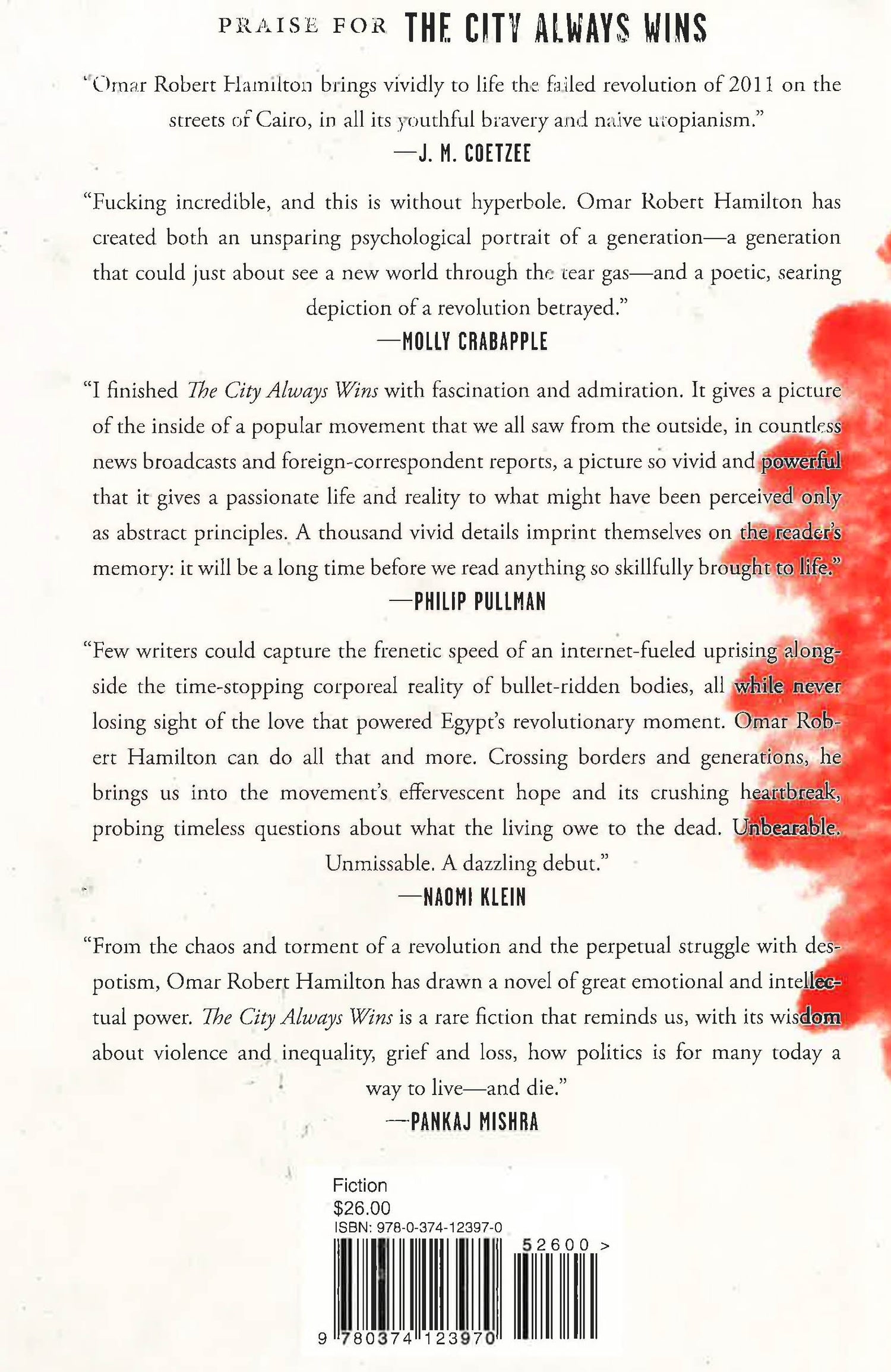 The City Always Wins is a novel from the front line of a revolution. Deeply enmeshed in the 2011 uprising in Tahrir Square, Mariam and Khalil move through Cairo’s surging streets and roiling political underground, their lives burning with purpose, their city alive in open revolt, the world watching, listening, as they chart a course into an unknown future. They are - they believe - fighting a new kind of revolution; they are players in a new epic in the making.But as regimes crumble and the country shatters into ideological extremes, Khalil and Mariam’s commitment - to the ideals of revolution and to one another - is put to the test.From the highs of street battles against the police to the paralysis of authoritarianism, Omar Robert Hamilton’s bold debut cuts straight from the heart of one of the key chapters of the twenty-first century.Arrestingly visual, intensely lyrical, uncompromisingly political, and brutal in its poetry, The City Always Wins is a novel not just about Egypt’s revolution, but also about a global generation that tried to change the world.