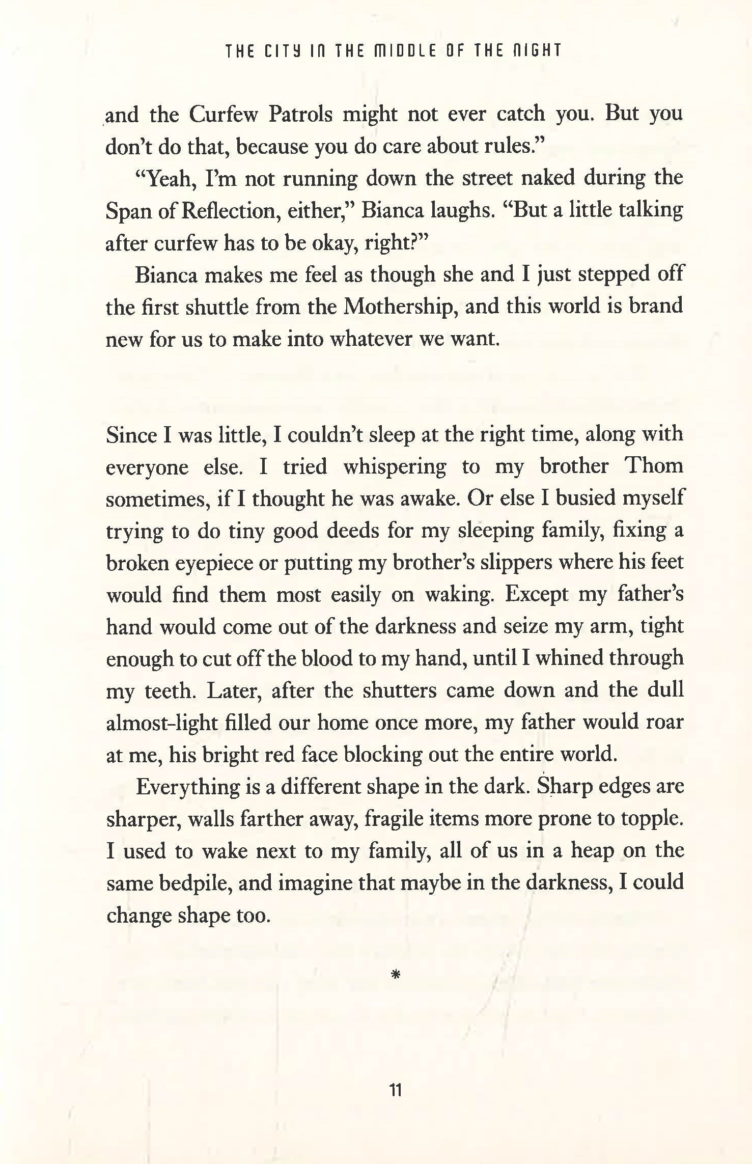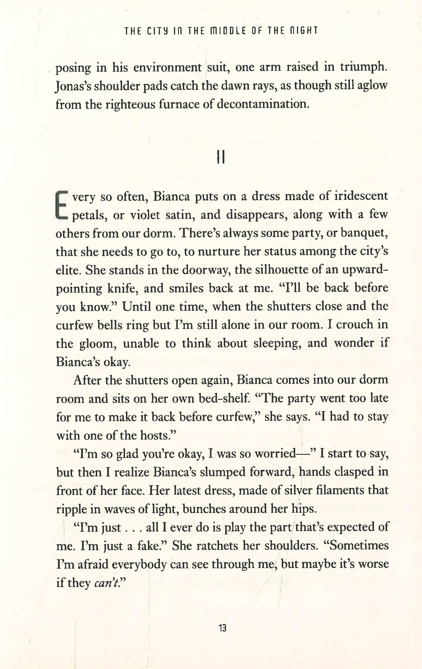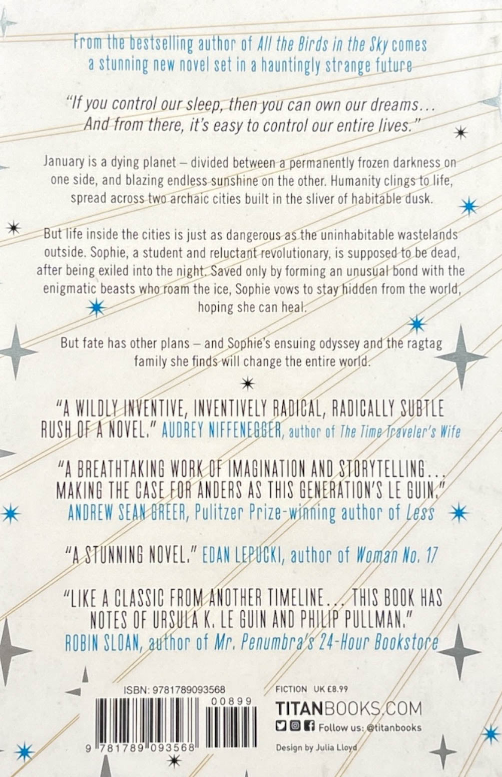 Would you give up everything to change the world?Humanity clings to life on January--a colonized planet divided between permanently frozen darkness on one side, and blazing endless sunshine on the other.Two cities, built long ago in the meager temperate zone, serve as the last bastions of civilization--but life inside them is just as dangerous as the uninhabitable wastelands outside.Sophie, a young student from the wrong side of Xiosphant city, is exiled into the dark after being part of a failed revolution. But she survives--with the help of a mysterious savior from beneath the ice.Burdened with a dangerous, painful secret, Sophie and her ragtag group of exiles face the ultimate challenge--and they are running out of time.Welcome to the City in the Middle of the Night