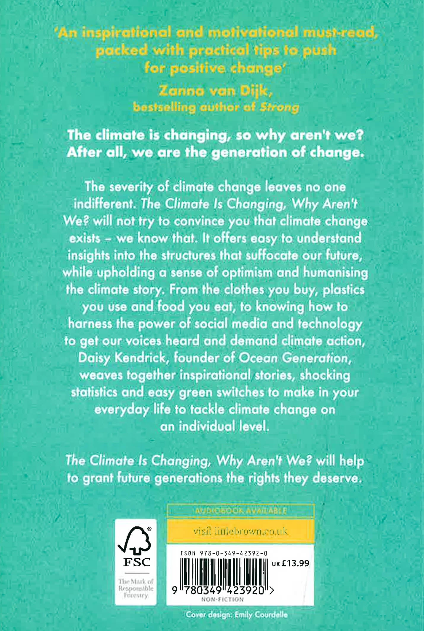 An inspirational and motivational must-read, packed with practical tips to push for positive change' Zanna van DijkThe climate is changing, so why aren't we? After all, we are the generation of change. The severity of climate change leaves no one indifferent. The Climate is Changing, Why Aren't We? will not try to convince you that climate change exists - we know that. It offers easy to understand insights into the structures that suffocate our future, while upholding a sense of optimism and humanising the climate story. From the clothes you buy, plastics you use and food you eat, to knowing how to harness the power of social media and technology to get our voices heard and demand climate action, Daisy Kendrick, founder of Ocean Generation, weaves together inspirational stories, shocking statistics and easy green switches to make in your everyday life to tackle climate change on an individual level. The Climate is Changing, Why Aren't We? will help to grant future generations the rights they deserve.