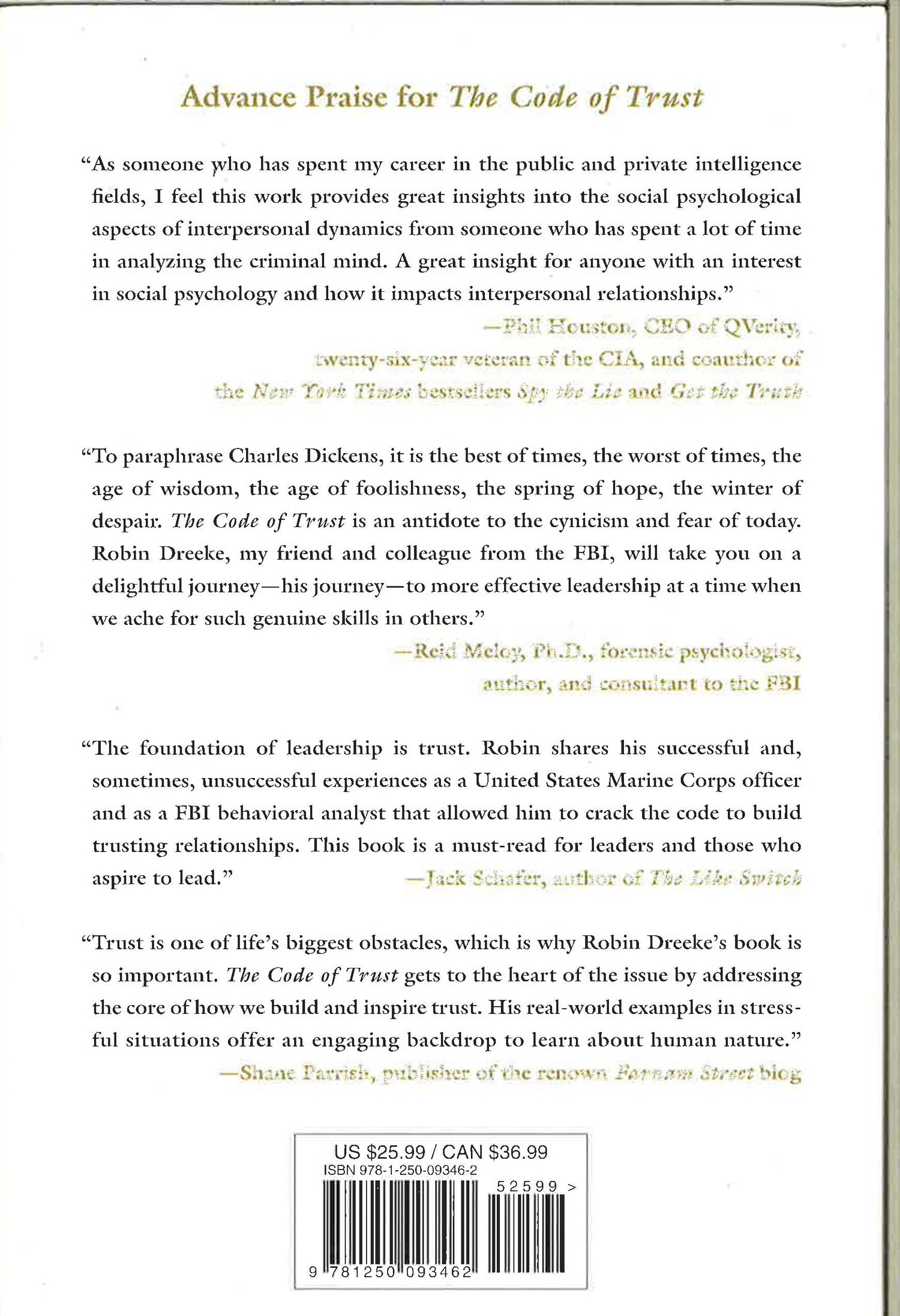 A counterintelligence expert shows readers how to use trust to achieve anything in business and in life.Robin Dreeke is a 28-year veteran of federal service, including the United States Naval Academy, United States Marine Corps. He served most recently as a senior agent in the FBI, with 20 years of experience. He was, until recently, the head of the Counterintelligence Behavioral Analysis Program, where his primary mission was to thwart the efforts of foreign spies, and to recruit American spies. His core approach in this mission was to inspire reasonable, well-founded trust among people who could provide valuable information.The Code of Trust is based on the system Dreeke devised, tested, and implemented during years of field work at the highest levels of national security. Applying his system first to himself, he rose up through federal law enforcement, and then taught his system to law enforcement and military officials throughout the country, and later to private sector clients. The Code of Trust has since elevated executives to leadership, and changed the culture of entire companies, making them happier and more productive, as morale soared.Inspiring trust is not a trick, nor is it an arcane art. It’s an important, character-building endeavor that requires only a sincere desire to be helpful and sensitive, and the ambition to be more successful at work and at home. To be successful with this system, a reader needs only the willingness to spend eight to ten hours learning a method of trust-building that took Robin Dreeke almost a lifetime to create.