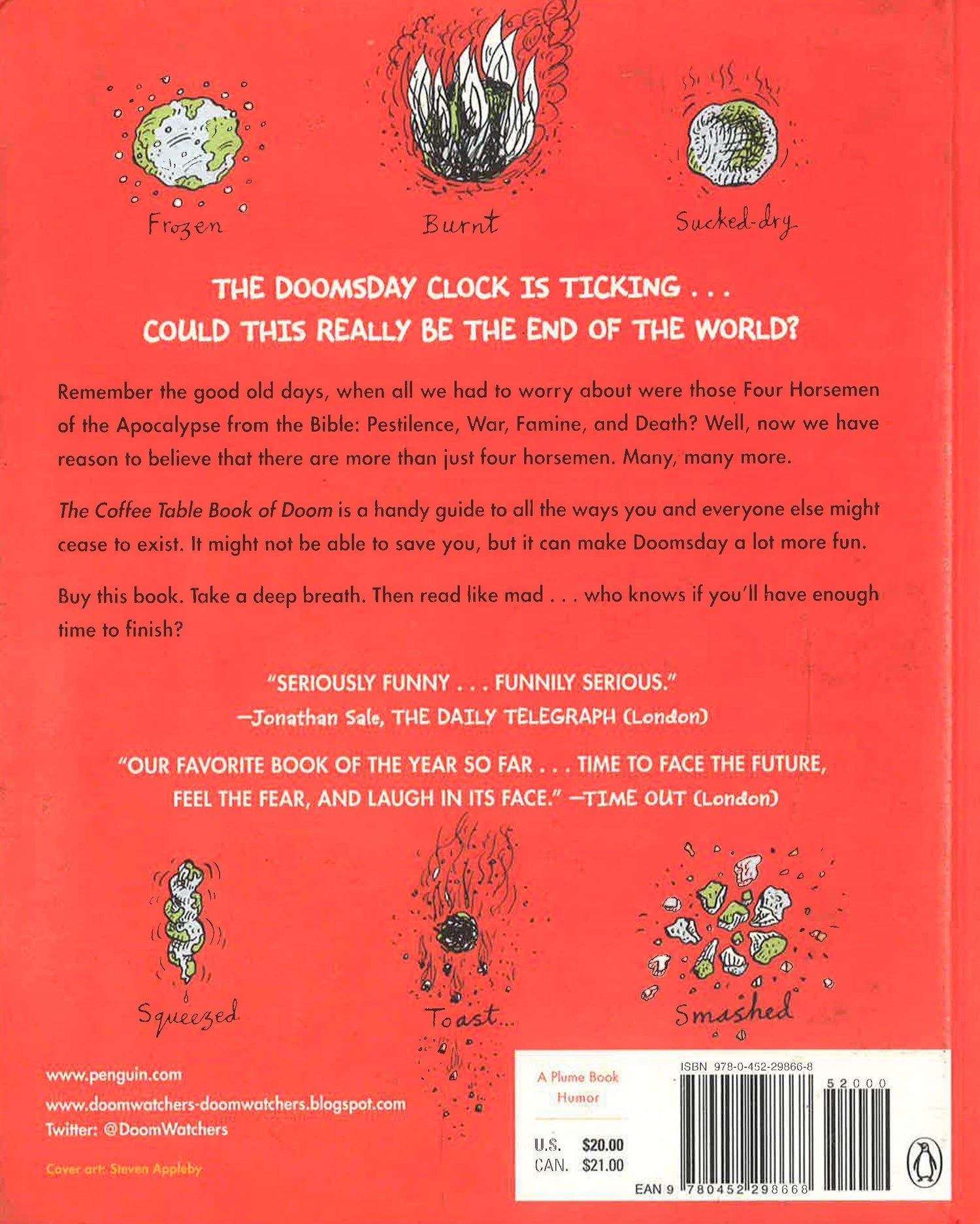Remember the good old days, when all we had to worry about were those Four Horsemen of the Apocalypse from the Bible: Pestilence, War, Famine and Death? Well, now we have reason to believe that there are more than just four horsemen. Many, many more. The Coffee Table Book of Doom is a handy guide to all the ways you and everyone else might cease to exist. It might not be able to save you, but it can make Doomsday a lot more fun. Buy this book. Take a deep breath. Then read like mad?who knows if you?ll have enough time to finish?