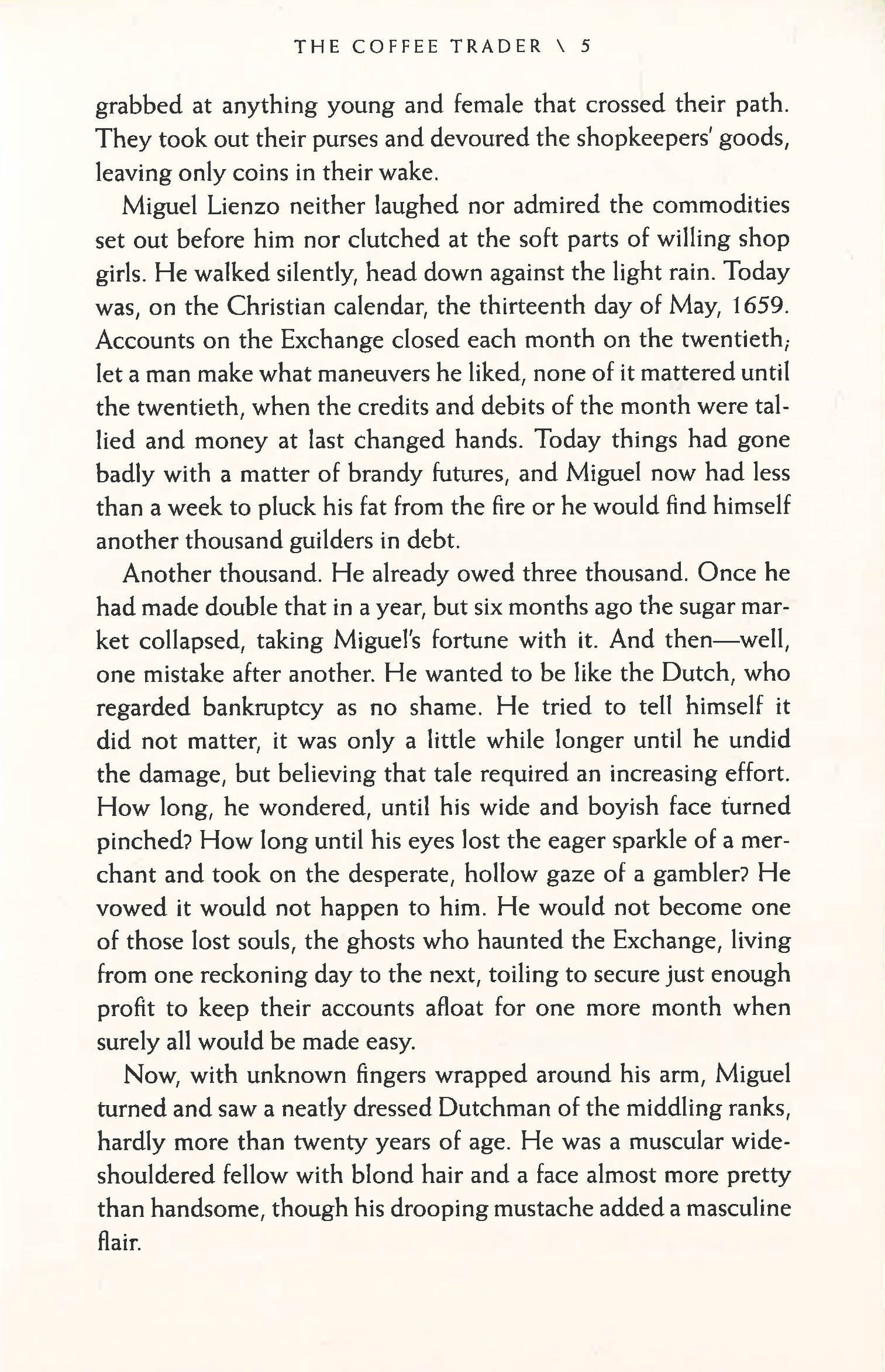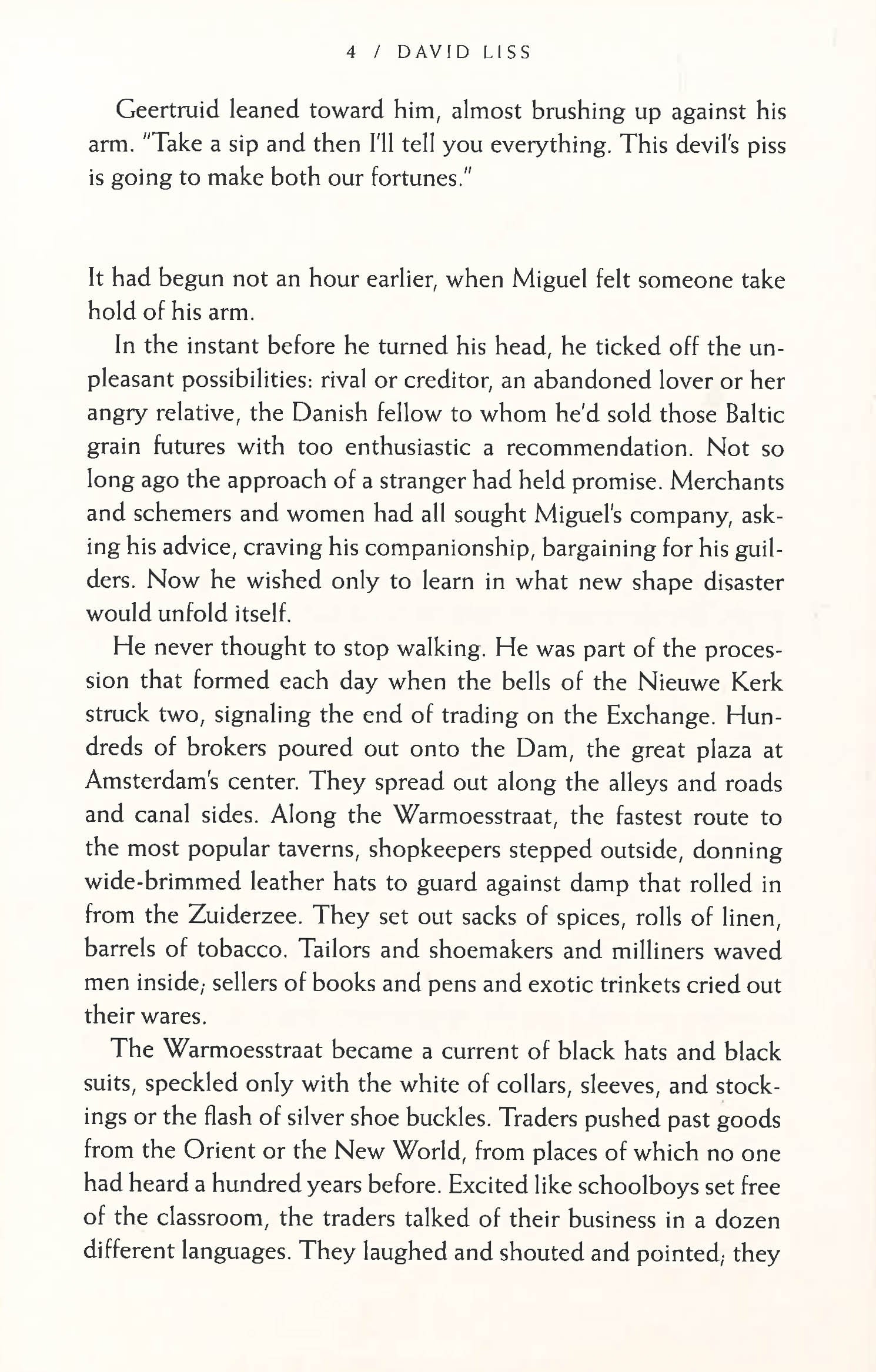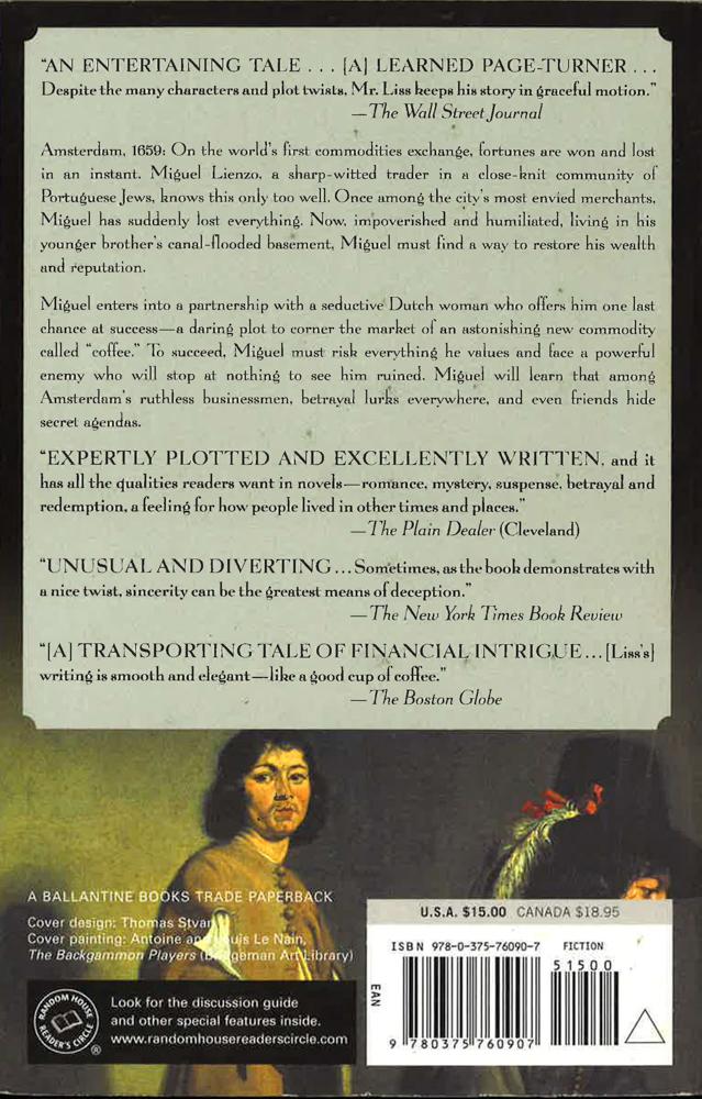Amsterdam, 1659: On the world's first commodities exchange, fortunes are won and lost in an instant. Miguel Lienzo, a sharp-witted trader in the city's close-knit community of Portuguese Jews, knows this only too well. Once among the city's most envied merchants, Miguel has suddenly lost everything. Now, impoverished and humiliated, living in his younger brother's canal-flooded basement, Miguel must find a way to restore his wealth and reputation. Miguel enters into a partnership with a seductive Dutchwoman who offers him one last chance at success--a daring plot to corner the market of an astonishing new commodity called "coffee." To succeed, Miguel must risk everything he values and face a powerful enemy who will stop at nothing to see him ruined. Miguel will learn that among Amsterdam's ruthless businessmen, betrayal lurks everywhere, and even friends hide secret agendas. *This book may have remainder mark*