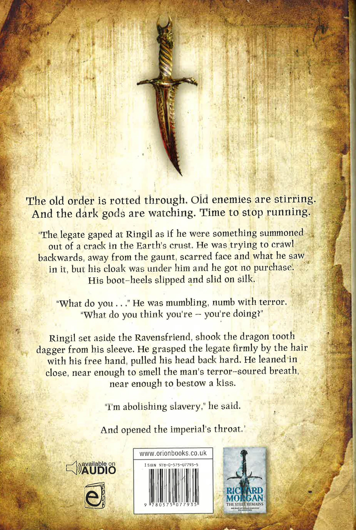 Ringil Eskiath, scarred wielder of the kiriath-forged broadsword Ravensfriend, is a man on the run - from his past and the family who have disowned him, from the slave trade magnates of Trelayne who want him dead, and apparently from the dark gods themselves, who are taking an interest but making no more sense than they ever have. Outlawed and exiled from his ancestral home in the north, Ringil has only one place left to turn - Yhelteth, city heart of the southern Empire, where perhaps he can seek asylum with the kiriath half-breed Archeth Indamaninarmal, former war comrade and now high-up advisor to the Emperor Jhiral Khimran II. But Archeth Indamaninarmal has problems of her own to contend with, as does her house guest, bodyguard and one time steppe nomad Egar the Dragonbane. And far from gaining the respite he is seeks, Ringil will instead find himself implicated in fresh schemes and doubtful allegiances no safer than those he has left behind. Old enemies are stirring, the old order is rotted through and crumbling, and though no-one yet knows it, the city of Yhelteth is about to explode ...