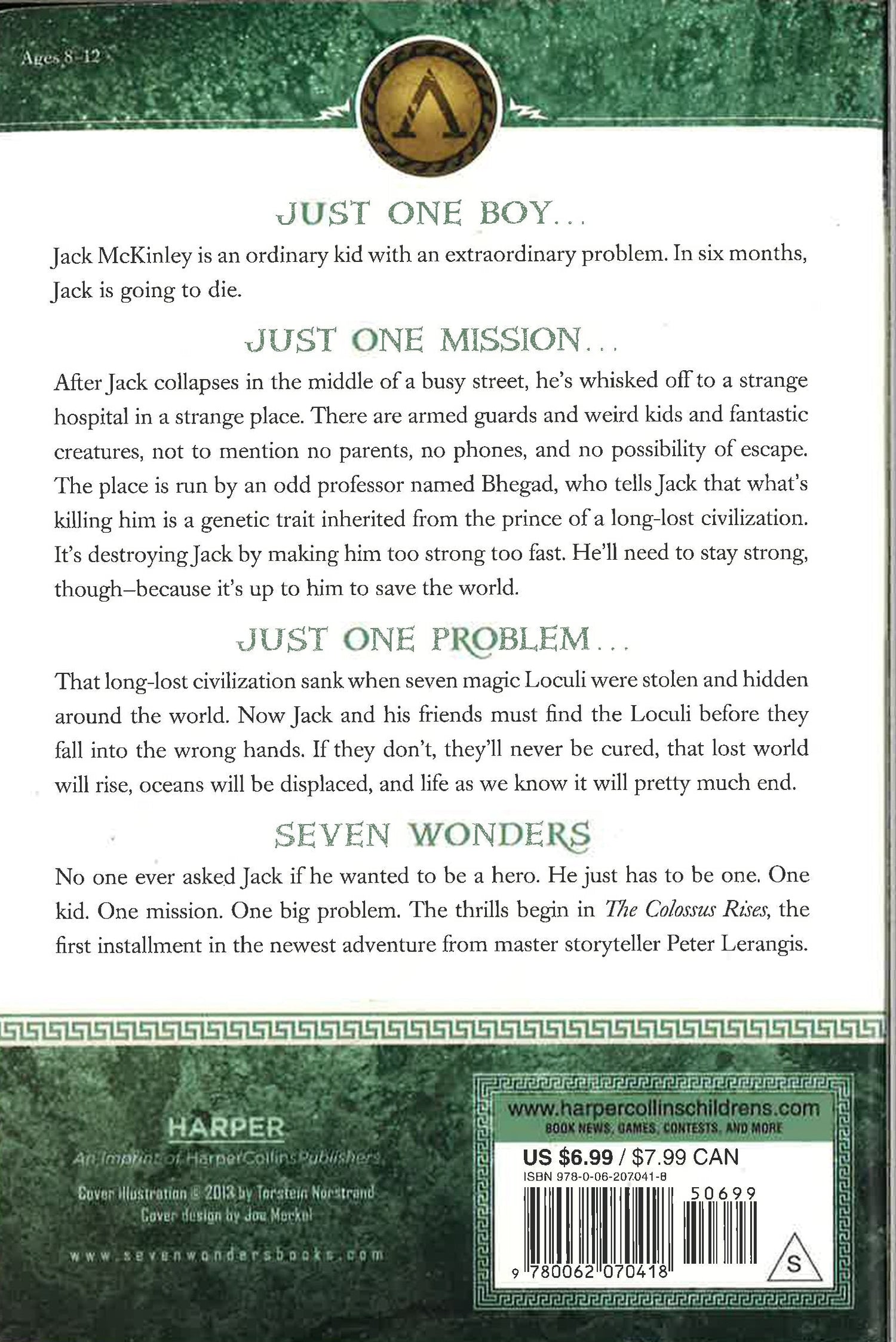 Just one boy . . . Jack McKinley is an ordinary kid with an extraordinary problem. In six months, Jack is going to die. Just one mission . . . After Jack collapses in the middle of a busy street, he's whisked off to a strange hospital in a strange place. There are armed guards and weird kids and fantastic creatures, not to mention no parents, no phones, and no possibility of escape. The place is run by an odd professor named Bhegad, who tells Jack that what's killing him is a genetic trait inherited from the prince of a long-lost civilization. It's destroying Jack by making him too strong too fast. He'll need to stay strong, though--because it's up to him to save the world. Just one problem . . . That long-lost civilization sank when seven magic Loculi were stolen and hidden around the world. Now Jack and his friends must find the Loculi before they fall into the wrong hands. If they don't, they'll never be cured, that lost world will rise, oceans will be displaced, and life as we know it will pretty much end. Seven wonders No one ever asked Jack if he wanted to be a hero. He just has to be one. One kid. One mission. One big problem. The thrills begin in The Colossus Rises, the first installment in the newest adventure from master storyteller Peter Lerangis.