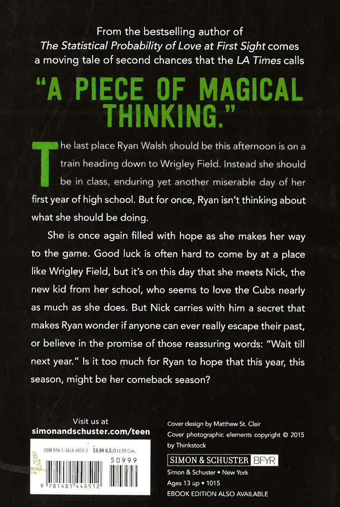 The last place Ryan Walsh should be this afternoon is on a train heading to Wrigley Field. She should be in class, enduring yet another miserable day of her first year of high school. But for once, Ryan isn't thinking about what she should be doing. She's not worried about her lack of friends, or her suffering math grade, or how it's been five whole years since the last time she was really and truly happy. Because she's finally returning to the place that her father loved, where the two of them spent so many afternoons cheering on their team. And on this - the fifth anniversary of his death - it feels like there's nowhere else in the world she should be. Ryan is once again filled with hope as she makes her way to the game. Good luck is often hard to come by at a place like Wrigley Field, but it's on this day that she meets Nick, the new kid from her school, who seems to love the Cubs nearly as much as she does. But Nick carries with him a secret that makes Ryan wonder if anyone can ever really escape their past, or believe in the promise of those reassuring words: "Wait till next year." Is it too much for Ryan to hope that this year, this season, might be her comeback season?