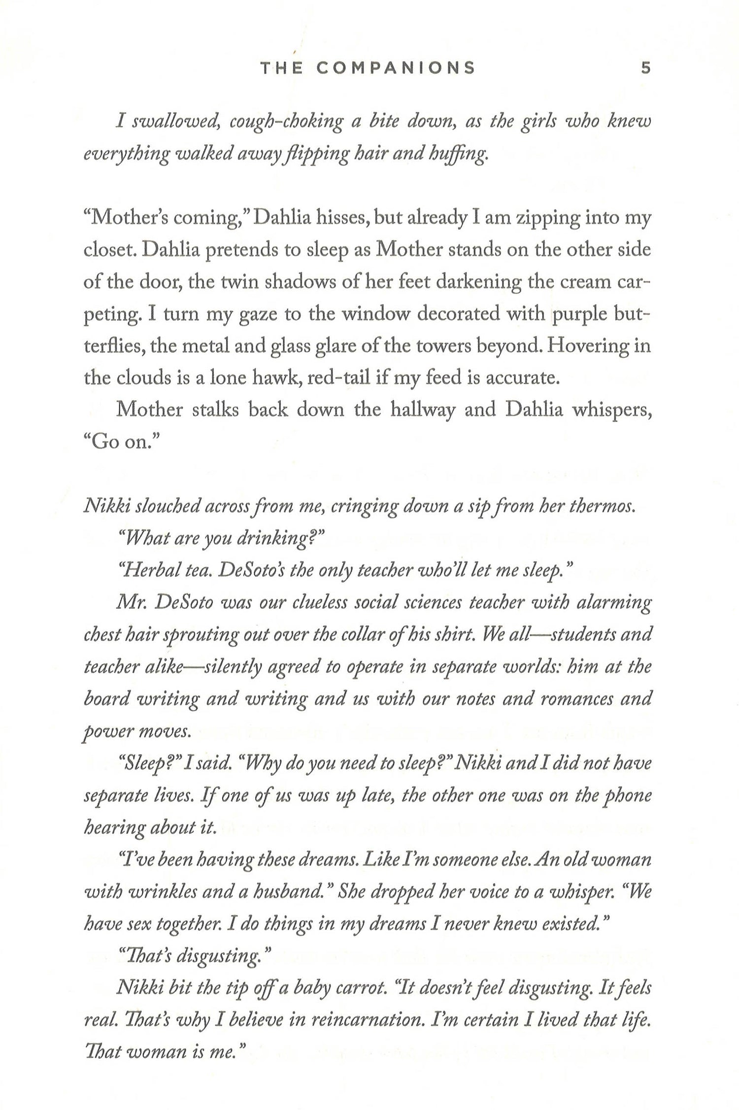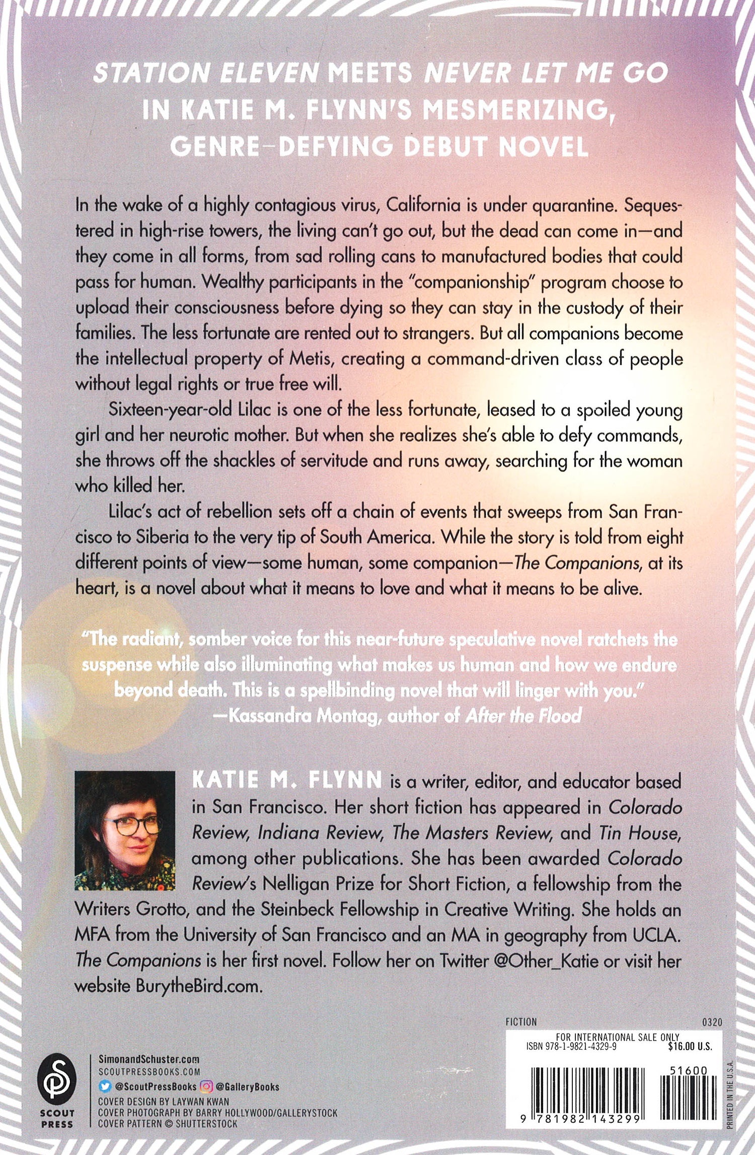 In the wake of a highly contagious virus, California is under quarantine. Sequestered in high rise towers, the living can't go out, but the dead can come in-and they come in all forms, from sad rolling cans to manufactured bodies that can pass for human. Wealthy participants in the "companionship" program choose to upload their consciousness before dying, so they can stay in the custody of their families. The less fortunate are rented out to strangers upon their death, but all companions become the intellectual property of Metis Corporation, creating a new class of people-a command-driven product-class without legal rights or true free will.