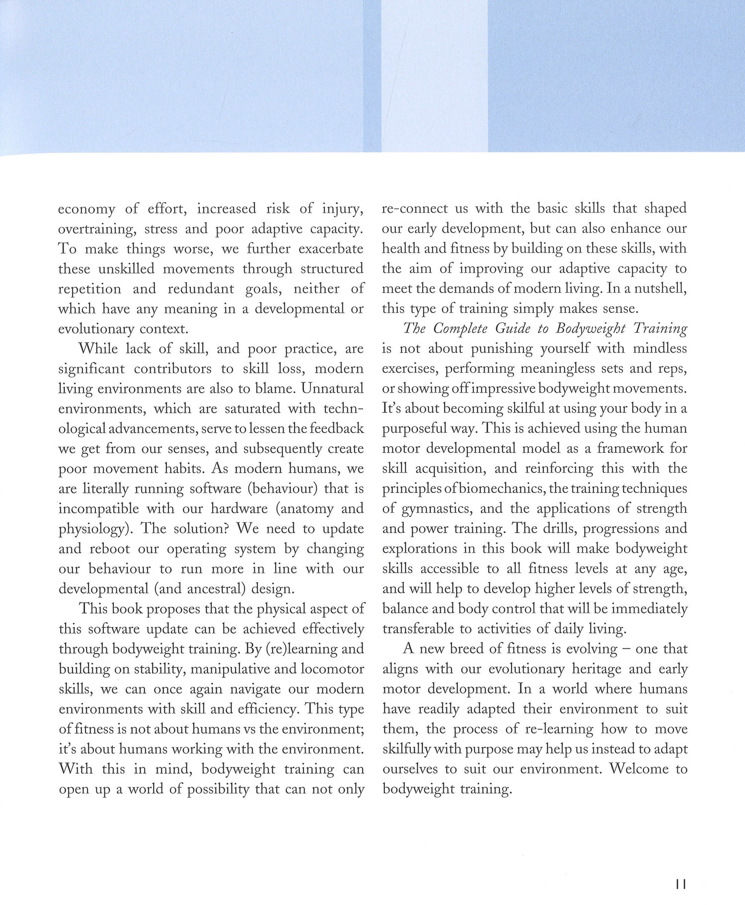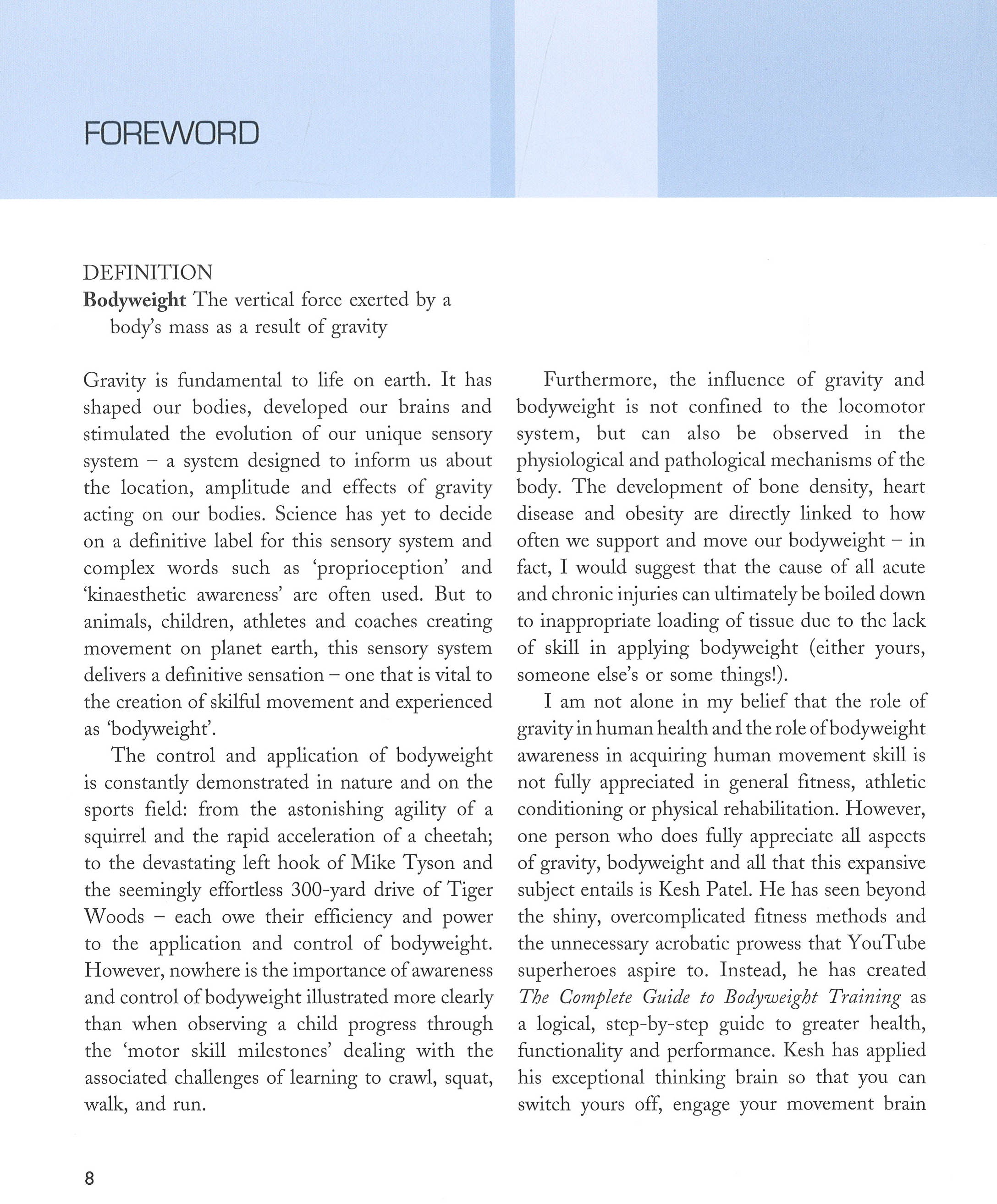 Bodyweight training is one of the growing global trends in fitness. It's simple enough to explain - using your own body weight to improve your fitness and strength, and yoga and gymnastic practitioners have been doing this for years. But the theory behind it isn't often understood. Kesh Patel contextualises bodyweight training - where did it come from? What is Evolutionary Fitness? and looks at the theory behind it. Understand the basics of biomechanics and you can adapt and improve your bodyweight training programmes and improve your results. So find out about working with gravity, how skills acquisition works, how to develop posture and balance - all based on biomechanical principles. This book is packed with practical, clear and accessible exercise ideas, progressing from fundamental movement patterns to more advanced exercises, along with details of exercise programming - including adaptations for different skill levels, working with groups, and ideas to integrate bodyweight exercises into traditional weight training, circuit and bootcamp classes, to name but a few.