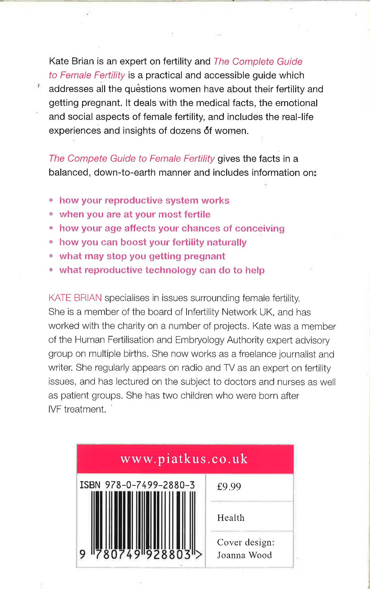 With warnings about rising infertility rates and the dangers of leaving motherhood too late, many women are concerned about when or whether they will manage to have a baby. Written by an international expert on fertility, THE COMPLETE GUIDE TO FEMALE FERTILITY deals with the medical facts, the emotional and social aspects of female fertility, and includes the real-life experiences and insights of dozens of women. It includes information on: * How your repoductive system works * When you are at your most fertile * How you age affects your chances of conceiving * How you can boost your fertility naturally * What may stop you getting pregnant * What reproductive technology can do to help.