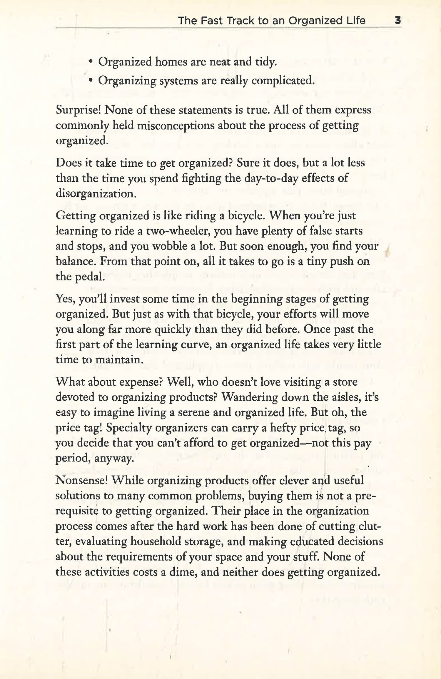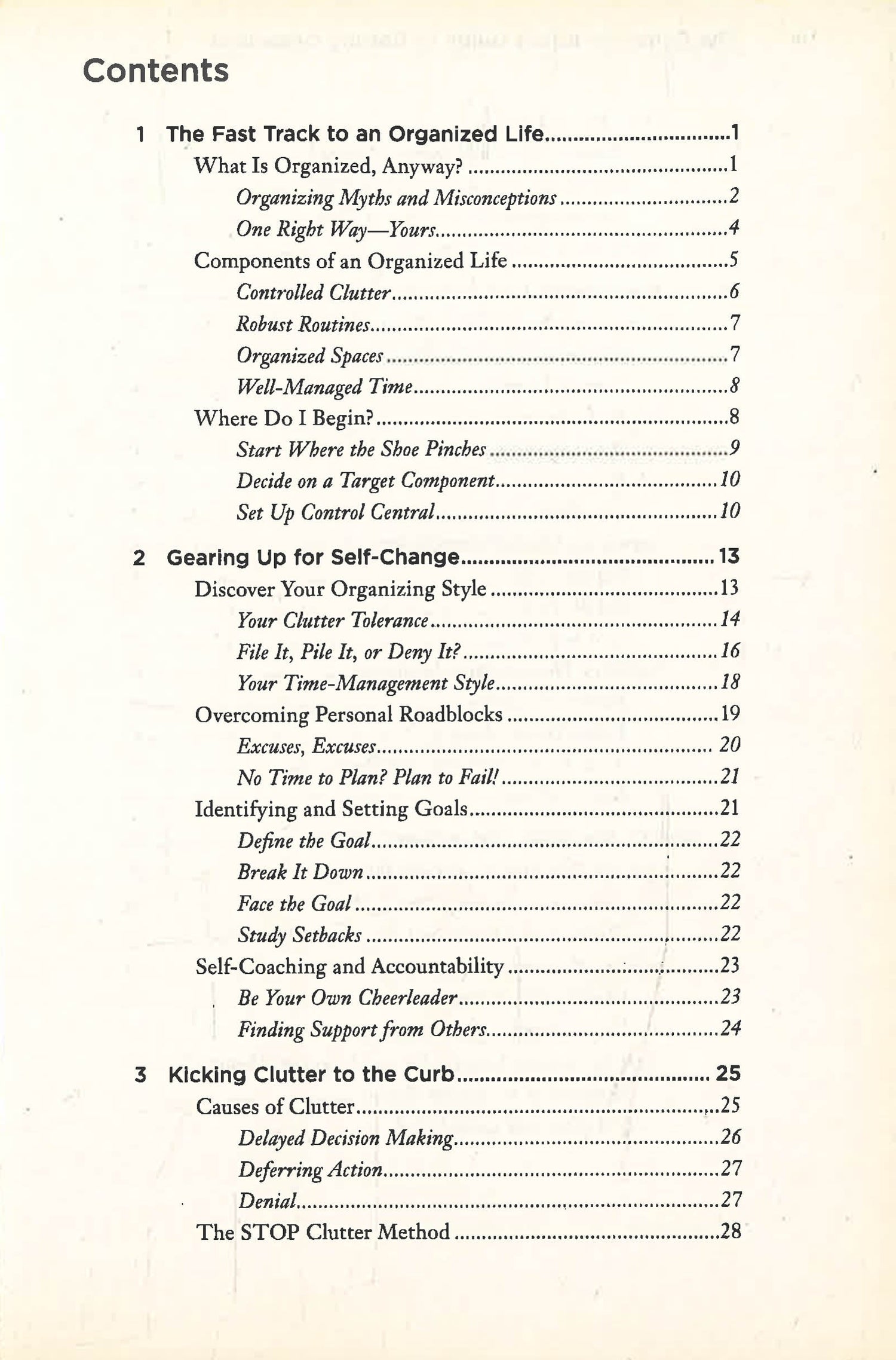 The principles behind effective organizing that can be applied to any situation in the home or office. A plan for clearing paper clutter and putting important documents where they can be found. Commonsense thoughts on prioritizing and letting go of objects that are no longer useful. A system for categorizing possessions that does not require people to buy more stuff to organize the stuff they already have. Tips for tackling disorganization hot spots, including home offices or dens, kitchens, closets, master bedrooms, garages, attics, and basement areas. Advice for staying ahead of messy family members or coworkers who can undo a person's hard work in an instant.