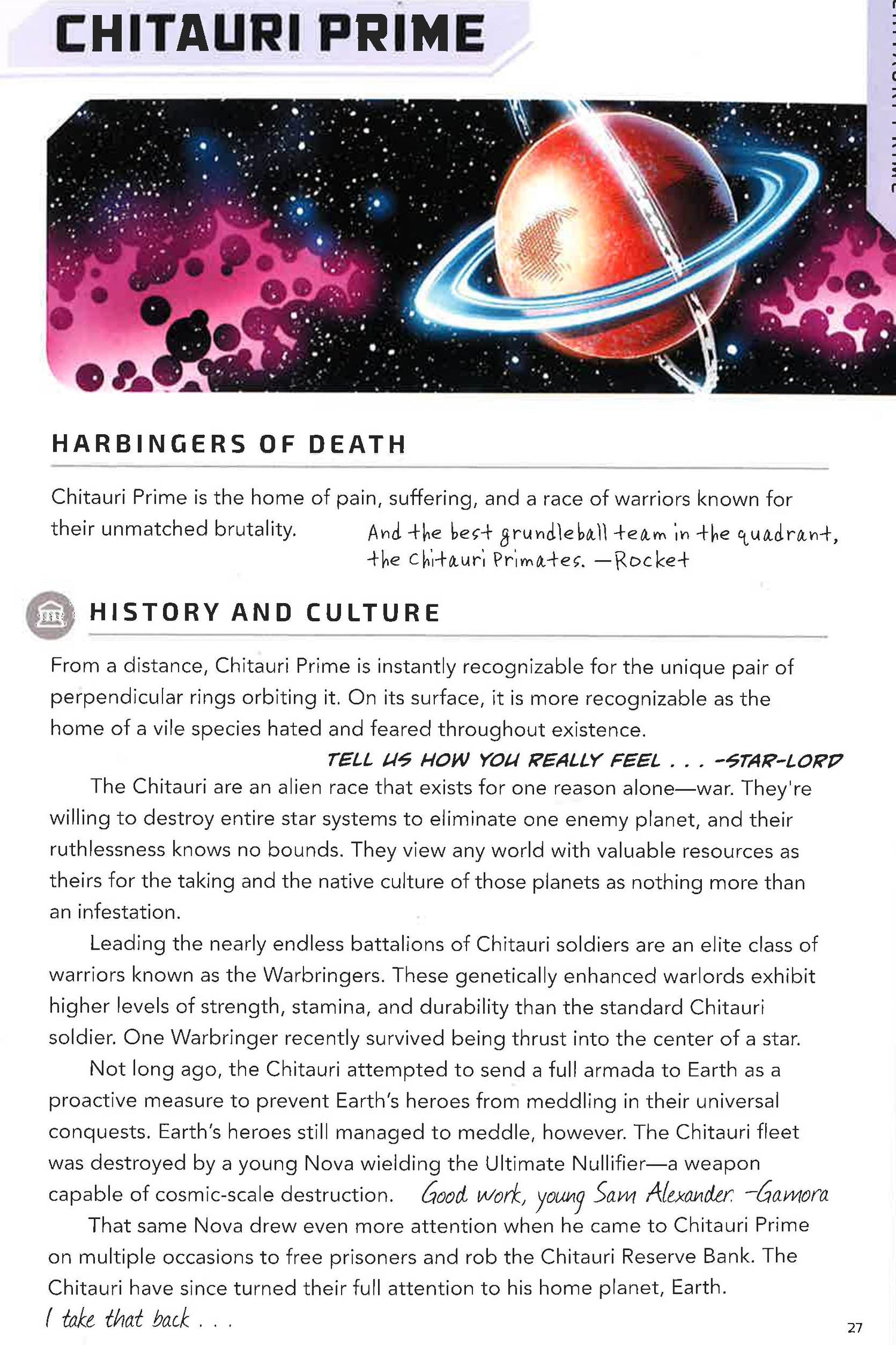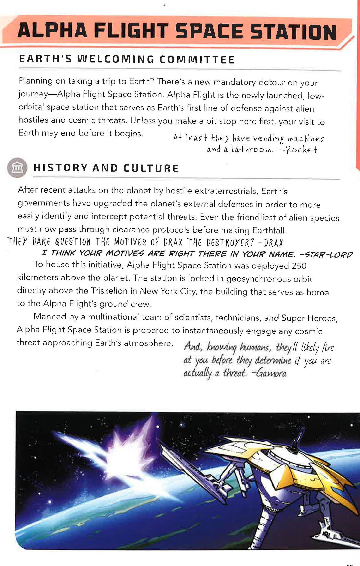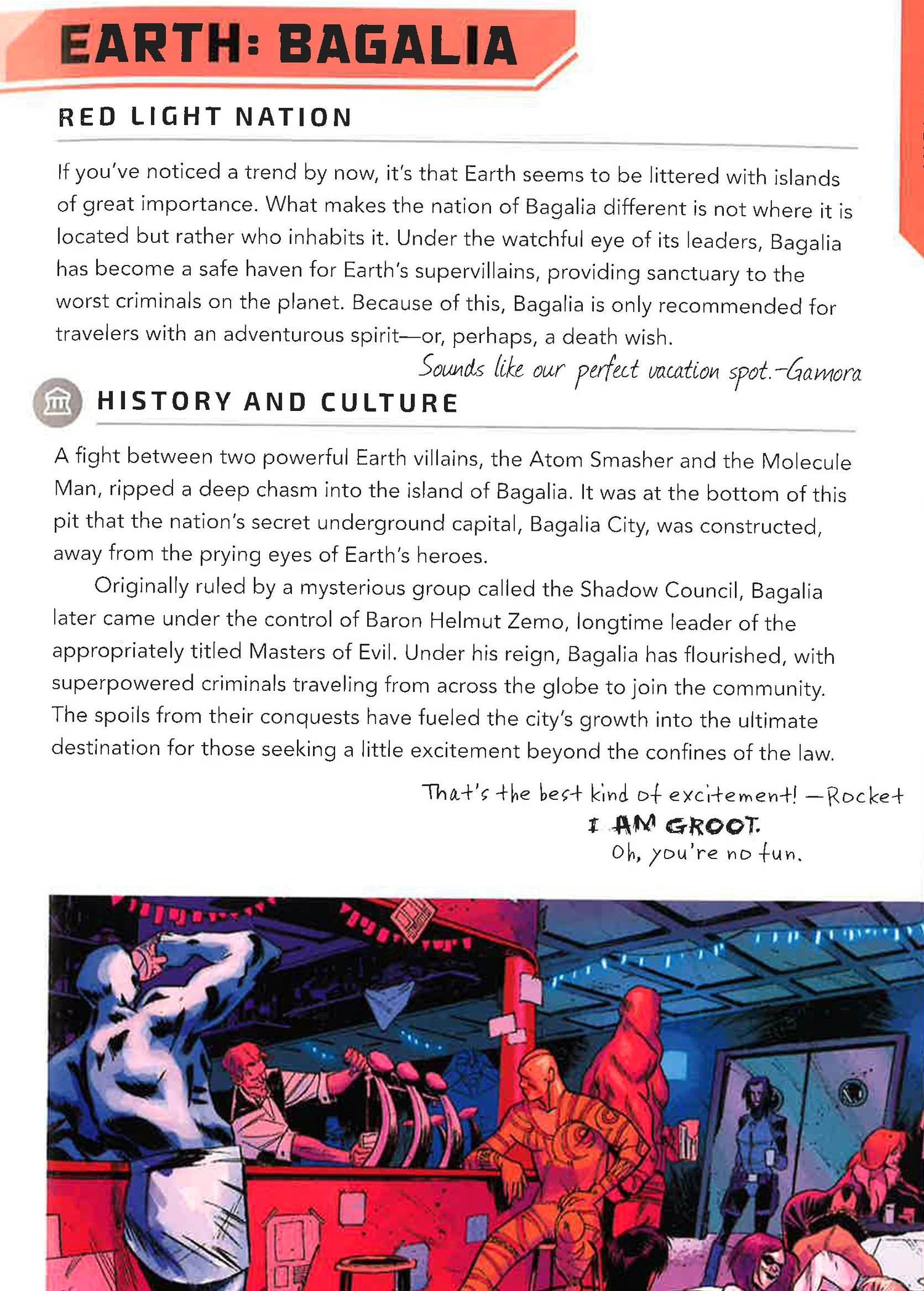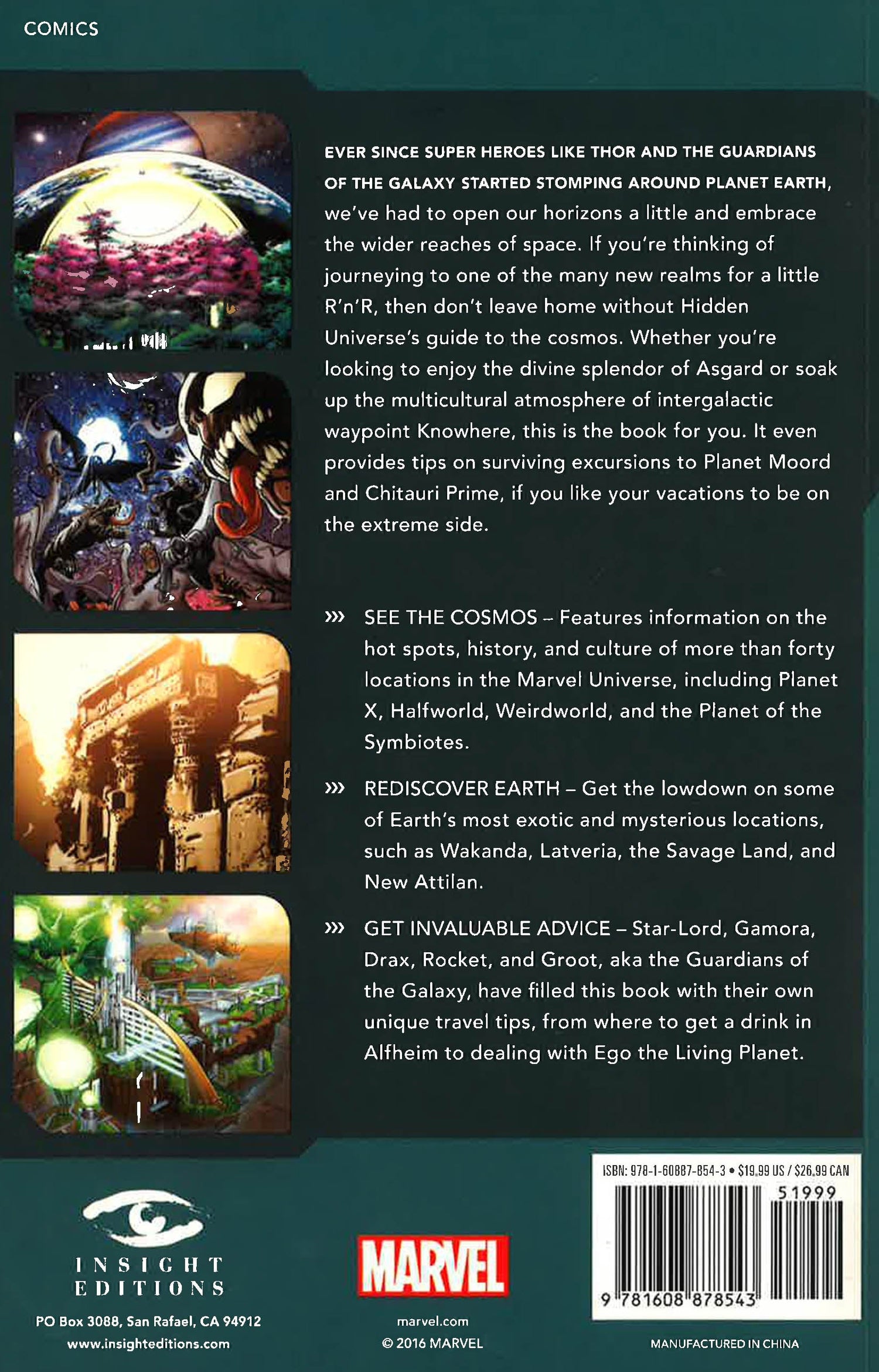 The ultimate guidebook to Earth, the Nine Realms, and other dimensions from Marvel Comics, as told by Peter Quill, Rocket, Groot, and the rest of the Guardians of the Galaxy. Ever since Super Heroes like Thor and the Guardians of the Galaxy started stomping around planet Earth, we've had to open our horizons a little and embrace the wider reaches of space. If you're thinking of journeying to one of the many new realms for a little R'n'R, then don't leave home without Hidden Universe's guide to the cosmos. Whether you're looking to enjoy the divine splendor of Asgard or soak up the multicultural atmosphere of intergalactic waypoint Knowhere, this is the book for you. It even provides some tips on surviving excursions to Planet Moord and Chitauri Prime, if you like your vacations to be on the extreme side. - SEE THE COSMOS - Features information on the hot spots, history, and culture of more than forty locations in the Marvel Universe, including Planet X, Halfworld, Weirdworld, and the Planet of the Symbiotes. - REDISCOVER EARTH - Get the lowdown on some of the Earth's most exotic and mysterious locations, such as Wakanda, Latveria, the Savage Land, and New Attilan. - GET INVALUABLE ADVICE - Star-Lord, Gamora, Drax, Rocket, and Groot, aka the Guardians of the Galaxy, have filled this book with their own unique travel tips, from where to get a drink in Alfheim to dealing with Ego the Living Planet.