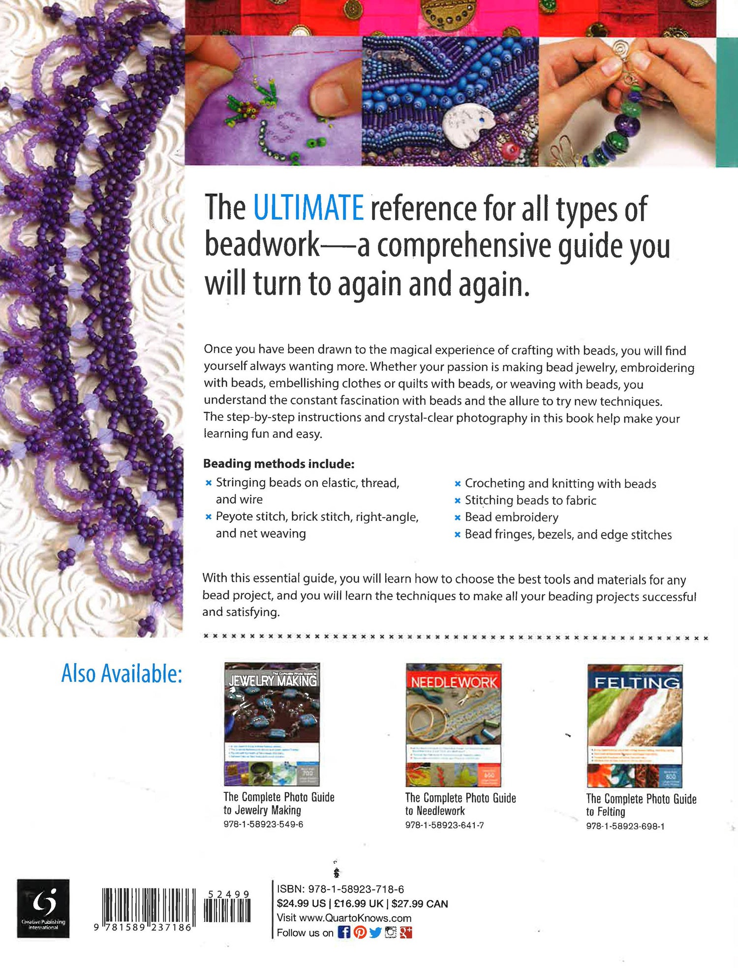 This comprehensive reference fully explores the various types of beadwork, including beading on fabric, fringing, bead weavings, bead embroidery, and beaded jewelry. With easy-to-follow organization, this guide provides step-by-step directions and 500 full color photos for clear understanding. Basic projects provide opportunities for crafters to try the techniques, and galleries of unique beaded designs and creations by various bead artists offer beautiful examples and inspiration. It s the only book you need to get started on beadwork. Begin your beading adventure today with The Complete Photo Guide to Beading!