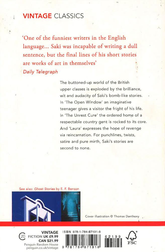 The buttoned-up world of the British upper classes is exploded by the brilliance, wit and audacity of Saki's bomb-like stories. In 'The Open Window' an imaginative teenager gives a visitor the fright of his life. In 'The Unrest Cure' the ordered home of a respectable country gent is rocked to its core. And 'Laura' expresses the hope of revenge via reincarnation. For punchlines, twists, satire and pure mirth, Saki's stories are second-to-none.