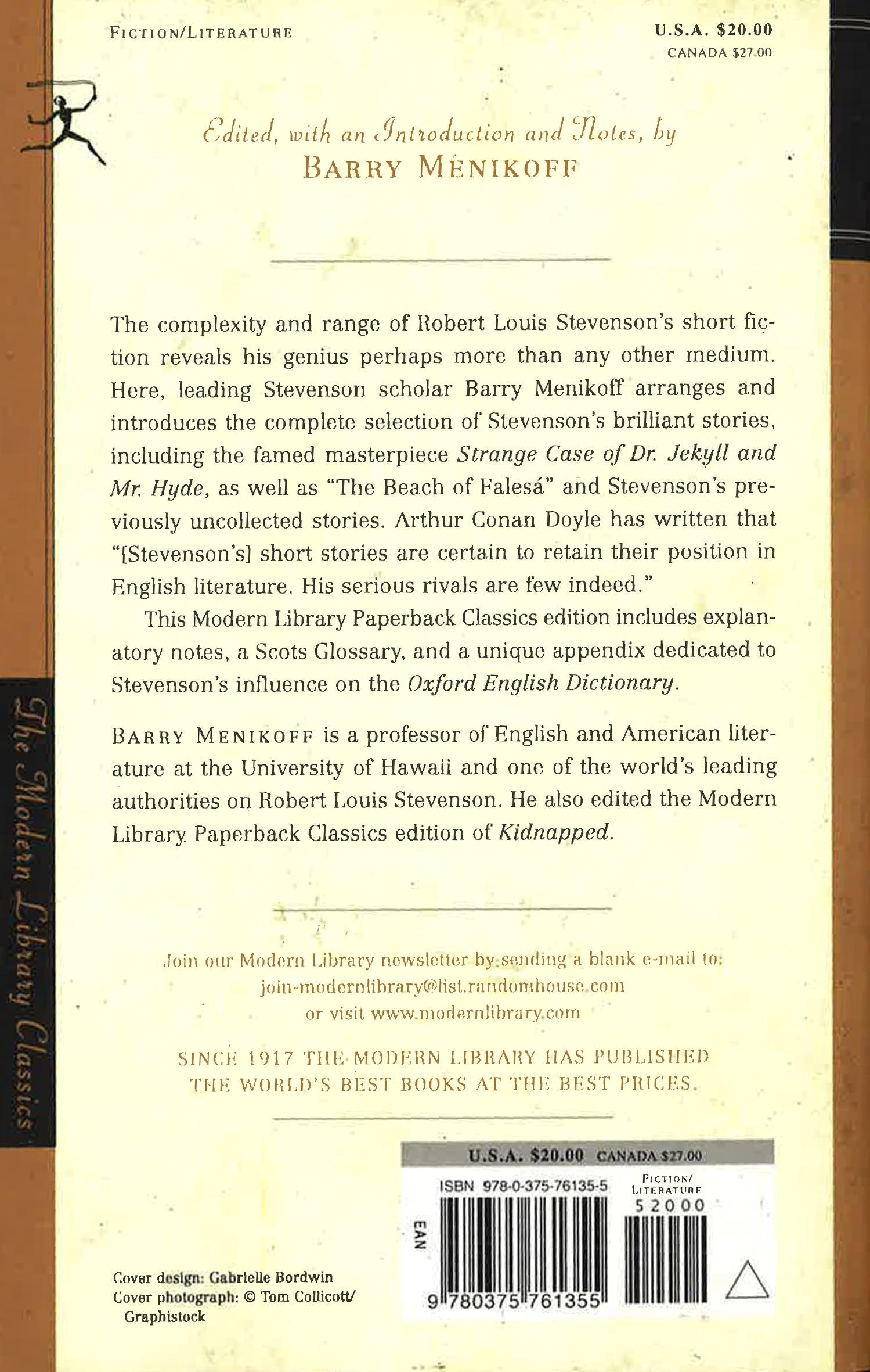 The complexity and range of Robert Louis Stevenson's short fiction reveals his genius perhaps more than any other medium. Here, leading Stevenson scholar Barry Menikoff arranges and introduces the complete selection of Stevenson's brilliant stories, including the famed masterpiece Strange Case of Dr. Jekyll and Mr. Hyde, as well as "The Beach of Falesá" and Stevenson's previously uncollected stories. Arthur Conan Doyle has written that "[Stevenson's] short stories are certain to retain their position in English literature. His serious rivals are few indeed." This Modern Library Paperback Classics edition includes explanatory notes, a Scots' Glossary, and a unique appendix dedicated to Stevenson's influence on the Oxford English Dictionary.