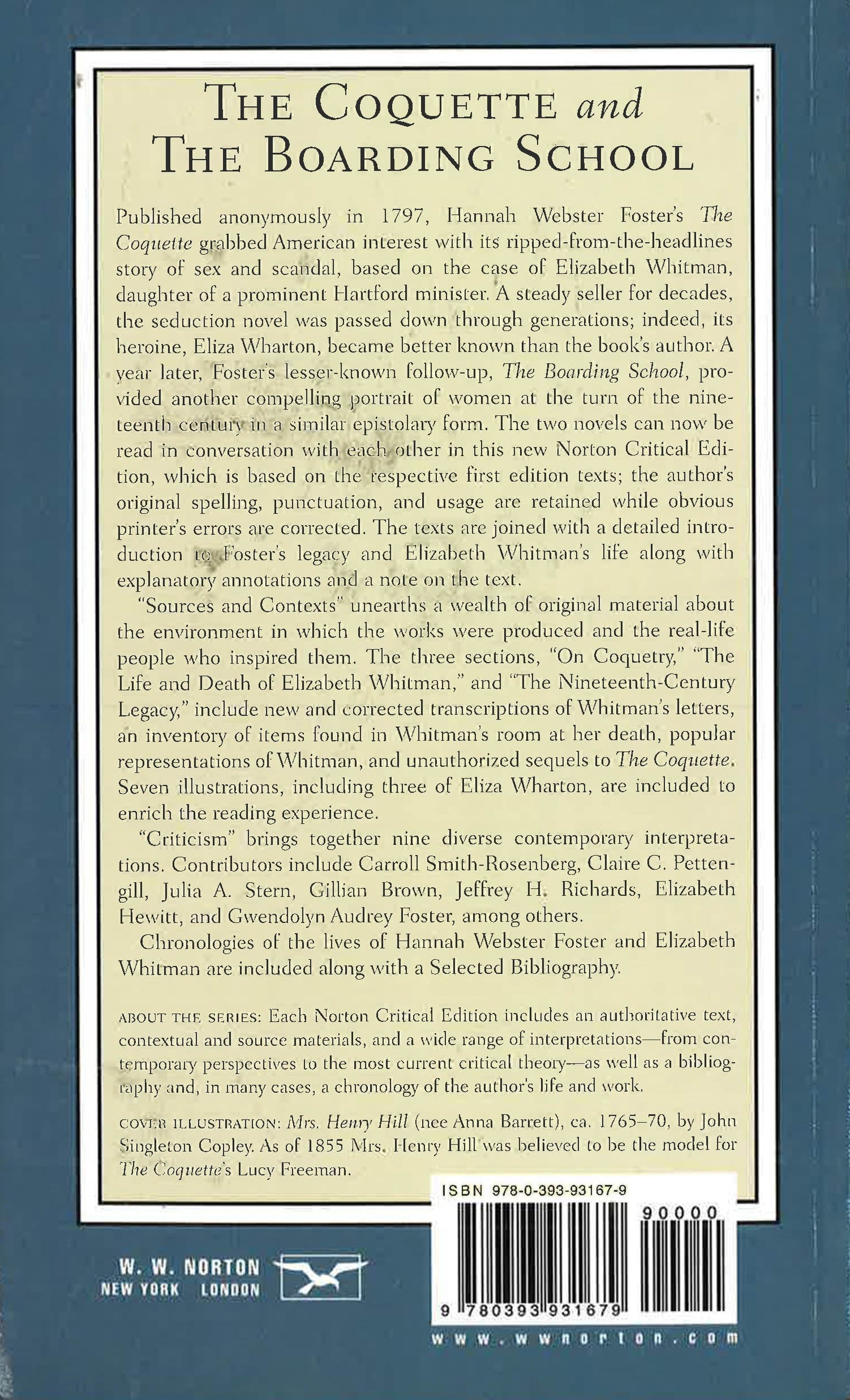 Hannah Webster Foster's two major Early American works with a wealth of primary materials are now available in a Norton Critical Edition. Published anonymously in 1797, Hannah Webster Foster's The Coquette grabbed American interest with its ripped-from-the-headlines story of sex and scandal. A steady best seller for decades, the seduction novel was passed down through generations; indeed, its heroine became better known than the book's author. A year later, Foster's lesser-known follow-up, The Boarding School, provided an equally compelling portrait of women at the turn of the nineteenth century in the same epistolary form. Both novels can now be read in conversation with each other in this new Norton Critical Edition based on the respective first edition texts; the author's original spelling, punctuation, and usage are retained while obvious printer's errors are corrected. The texts are joined with a detailed introduction to Foster's legacy and Elizabeth Whitman's life along with explanatory annotations and a note on the text. "Sources and Contexts" unearths a wealth of original material about the environment the works were produced in and the real-life people who inspired them. The three sections, "On Coquetry," "The Life and Death of Elizabeth Whitman," and "The Nineteenth-Century Legacy," include new and corrected transcriptions of Whitman's letters to Ruth and Joel Barlow, an inventory of items found at Whitman's room at her death, popular representations of Elizabeth Whitman, and unauthorized sequels to The Coquette. Seven illustrations, including three of Eliza Wharton, are included to enrich the reading experience. "Criticism" brings together nine diverse contemporary interpretations. Contributors include Carroll Smith-Rosenberg, Claire C. Pettengill, Julia A. Stern, Gillian Brown, Jeffrey H. Richards, and Gwendolyn Audrey Foster, among others. Chronologies of the lives of Hannah Webster Foster and Elizabeth Whitman are included along with a Selected Bibliography.