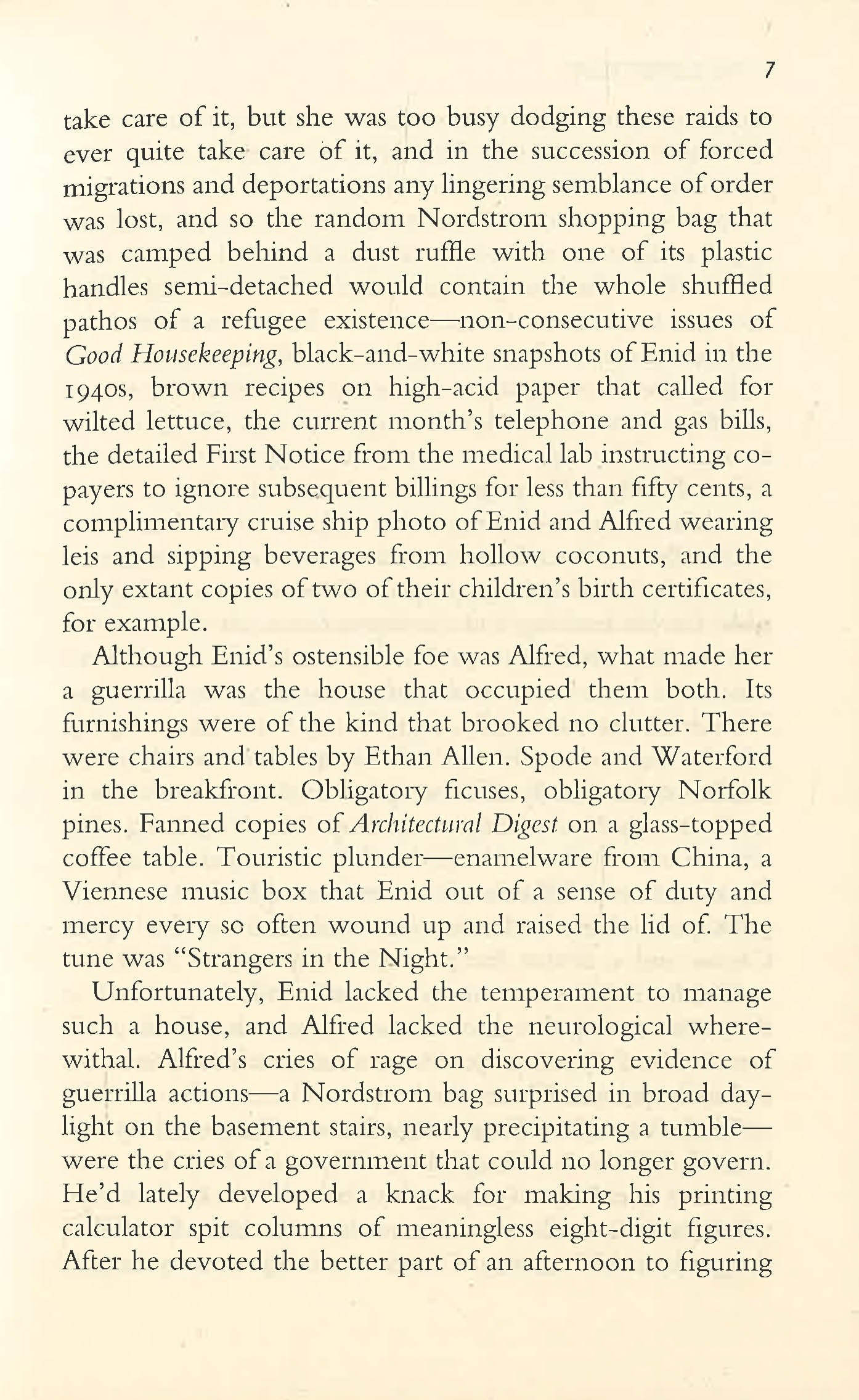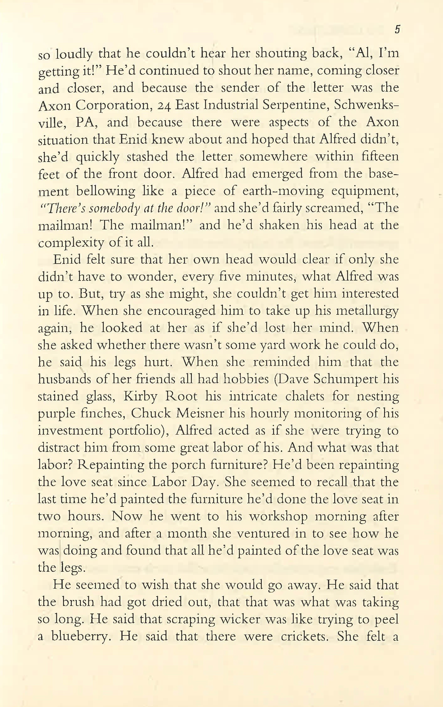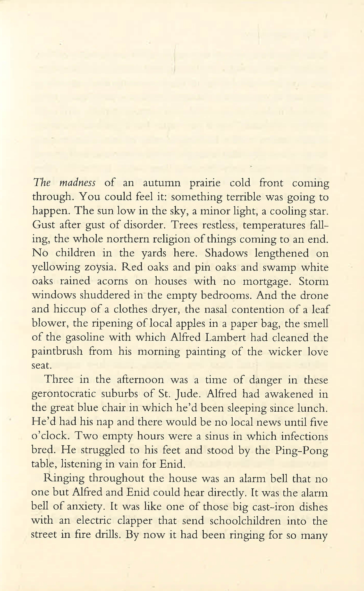 After fifty years as a wife and mother, Enid Lambert is ready to have some fun. Unfortunately her husband, Alfred, is losing his sanity, and their children have long since fled for the catastrophes of their own lives. As Alfred's condition worsens and the Lamberts are forced to face their secrets and failures, Enid sets her heart on one last family Christmas.