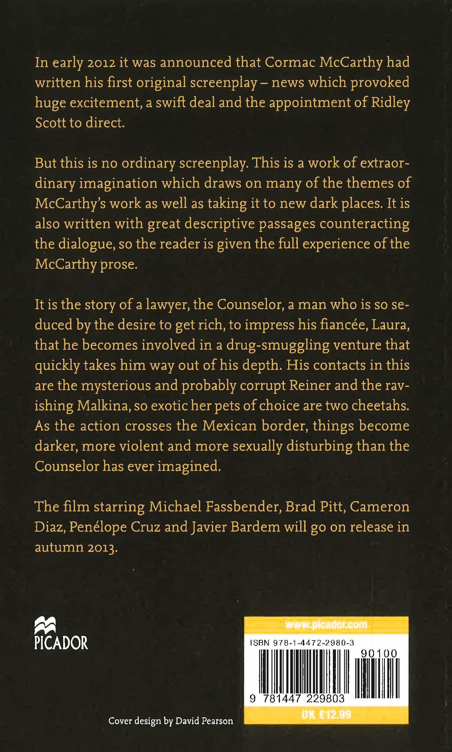 In early 2012 it was announced that Cormac McCarthy had written an original screenplay - news which provoked huge excitement, a swift deal and the appointment of Ridley Scott to direct. But this is no ordinary screenplay. This is a work of extraordinary imagination which draws on many of the themes of McCarthy's work as well as taking it to new dark places. It is also written with great descriptive passages counteracting the dialogue, so the reader is given the full experience of the McCarthy prose. It is the story of a lawyer, the Counselor, a man who is so seduced by the desire to get rich, to impress his fiancee Laura, that he becomes involved in a drug-smuggling venture that quickly takes him way out of his depth. His contacts in this are the mysterious and probably corrupt Reiner and the seductive Malkina, so exotic her pets of choice are two cheetahs. As the action crosses the Mexican border, things become darker, more violent and more sexually disturbing than the Counselor has ever imagined. The film starring Michael Fassbender, Penelope Cruz, Cameron Diaz, Javier Bardem and Brad Pitt will go on release in autumn 2013.