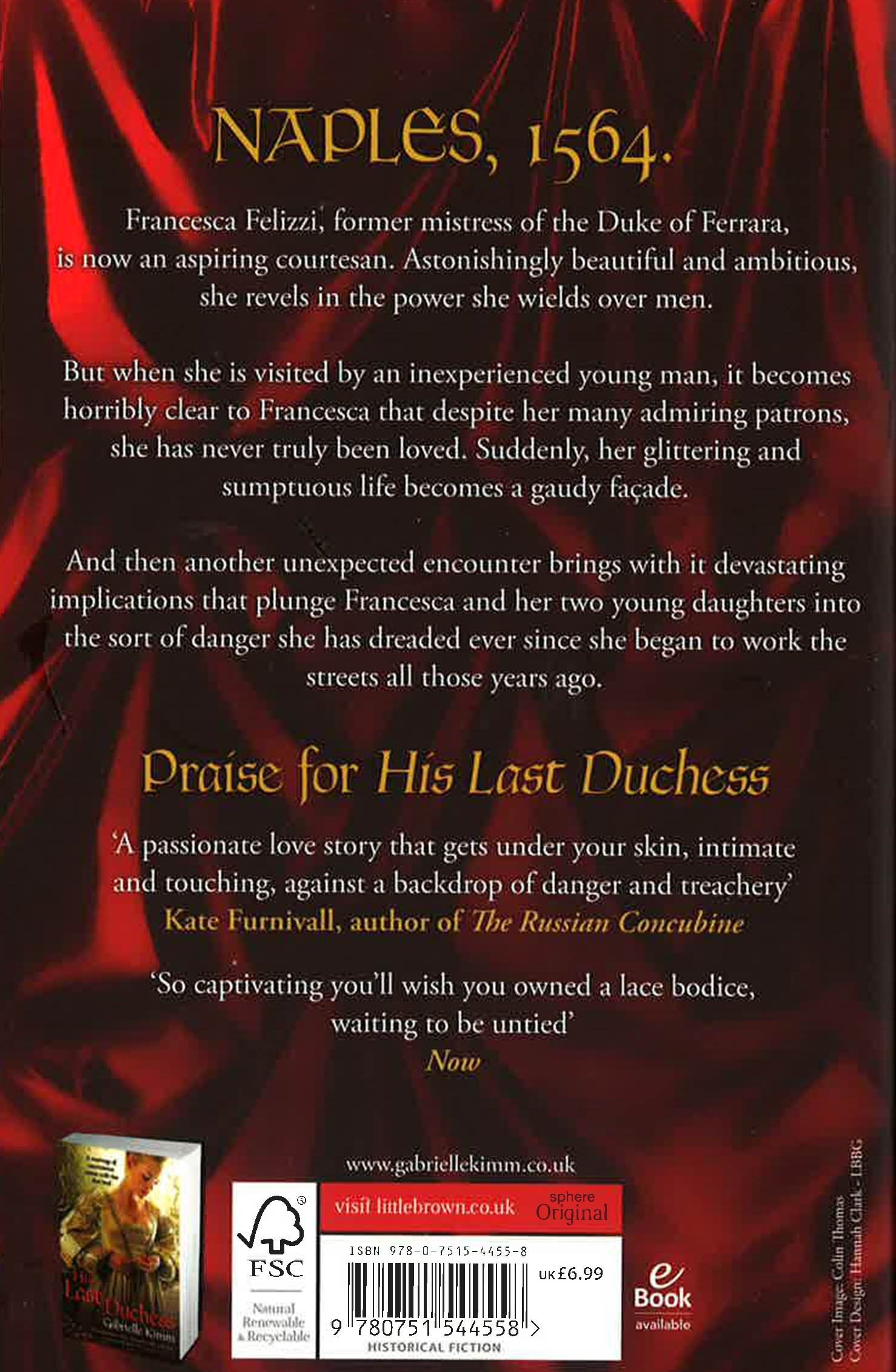 Francesca Felizzi, former mistress of the Duke of Ferrara, is now an aspiring courtesan. Astonishingly beautiful and ambitious, she revels in the power she wields over men.But when she is visited by an inexperienced young man, it becomes horribly clear to Francesca that despite her many admiring patrons, she has never truly been loved. Suddenly, her glittering and sumptuous life becomes a gaudy facade. And then another unexpected encounter brings with it devastating implications that plunge Francesca and her two young daughters into the sort of danger she has dreaded ever since she began to work the streets all those years ago.