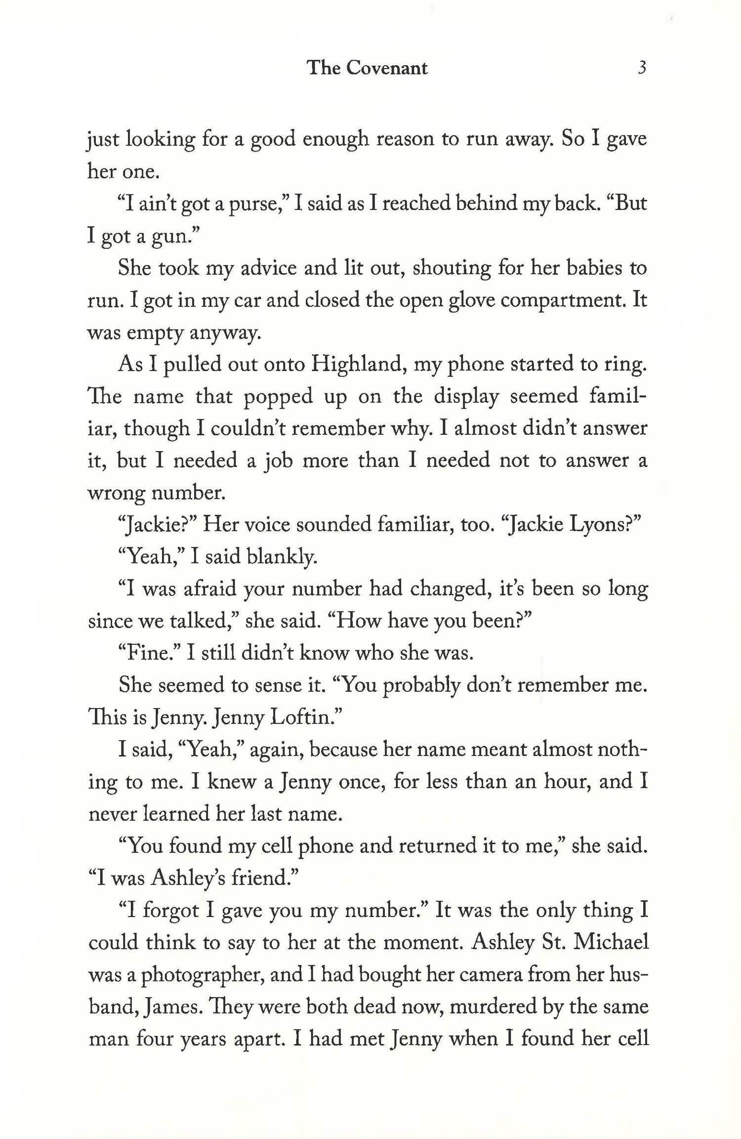 When photographer and former Memphis police detective Jackie Lyons finds Sam Loftin's lifeless body in the same location where his daughter died five years earlier, there's no reason to think he didn't kill himself, too. No reason, except Jackie has just seen Sam's ghost act out the last violent moments of his life. In investigating his murder, Jackie is drawn into a tumultuous battle between wealthy and powerful suburbanites and a charismatic preacher trying to serve the poor and homeless. But a deeper mystery lurks beneath the petty rivalries and jealousies of a gated community, one that stretches back into the distant past and reaches out to snare the youngest of this generation. A secret so dark, it can only be protected by "The Covenant."