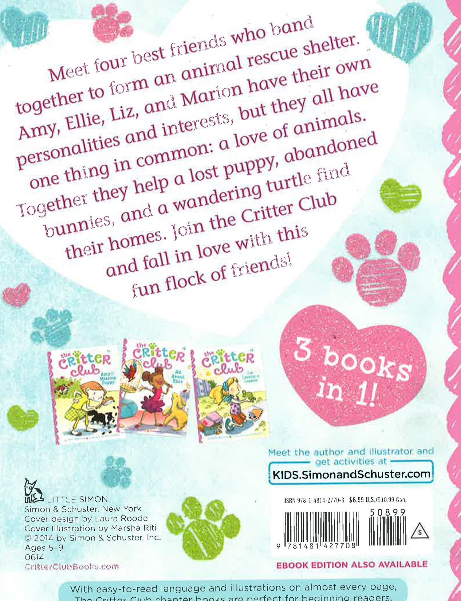 The first three Critter Club books are now available in one cuddly collection! In this bind-up of the first three Critter Club stories, read about four best friends who band together to form a rescue shelter to save lost and lonely animals in their town. Amy, Ellie, Liz, and Marion each have their own different personalities and interests, but they all have one thing in common: a serious love of animals. Together they help a lost puppy, abandoned bunnies, and a wandering turtle. Join The Critter Club and fall in love with this fun flock of friends! Included in this chapter book bind-up are: