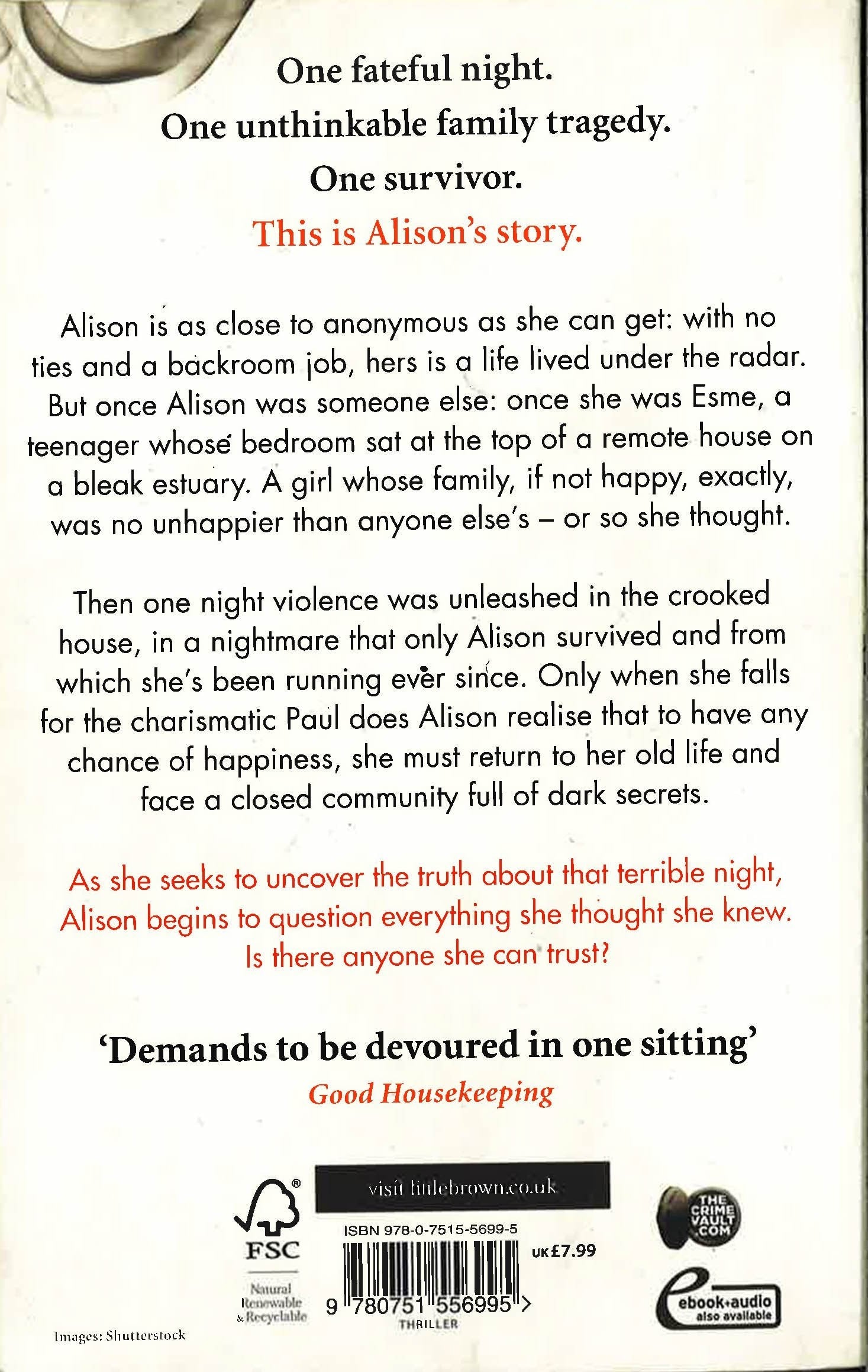 One fateful night. One unthinkable family tragedy. One survivor. This is Alison's story.Perfect for fans of The Girl on the Train and Apple Tree Yard, this stunning psychological thriller from the author of The Loving Husband follows one woman's search for the truth about her family history.Alison is as close to anonymous as she can get: with no ties and a backroom job, hers is a life lived under the radar. But once Alison was someone else: once she was Esme, a teenager whose bedroom sat at the top of a remote house on a bleak estuary. A girl whose family, if not happy, exactly, was no unhappier than anyone else's - or so she thought. Then one night violence was unleashed in the crooked house, in a nightmare that only Alison survived and from which she's been running ever since. Only when she falls for the charismatic Paul does Alison realise that to have any chance of happiness, she must return to her old life and face a closed community full of dark secrets.As she seeks to uncover the truth of what happened that terrible night, Alison begins to question everything she thought she knew. Is there anyone she can trust?