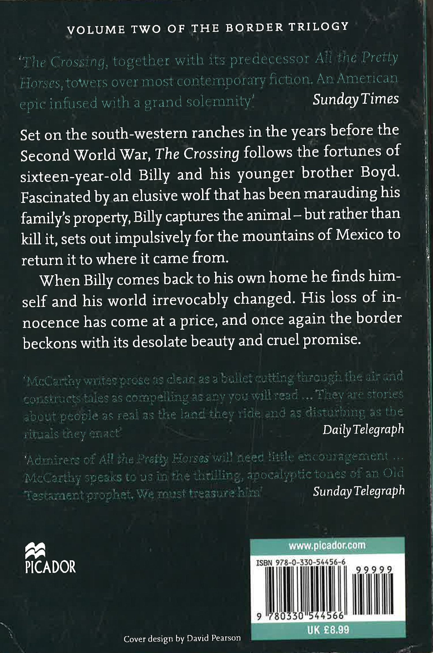 In The Crossing, Cormac McCarthy fulfills the promise of All the Pretty Horses and at the same time give us a work that is darker and more visionary, a novel with the unstoppable momentum of a classic western and the elegaic power of a lost American myth. In the late 1930s, sixteen-year-old Billy Parham captures a she-wolf that has been marauding his family's ranch. But instead of killing it, he decides to take it back to the mountains of Mexico. With that crossing, he begins an arduous and often dreamlike journey into a country where men meet ghosts and violence strikes as suddenly as heat-lightning--a world where there is no order "save that which death has put there."