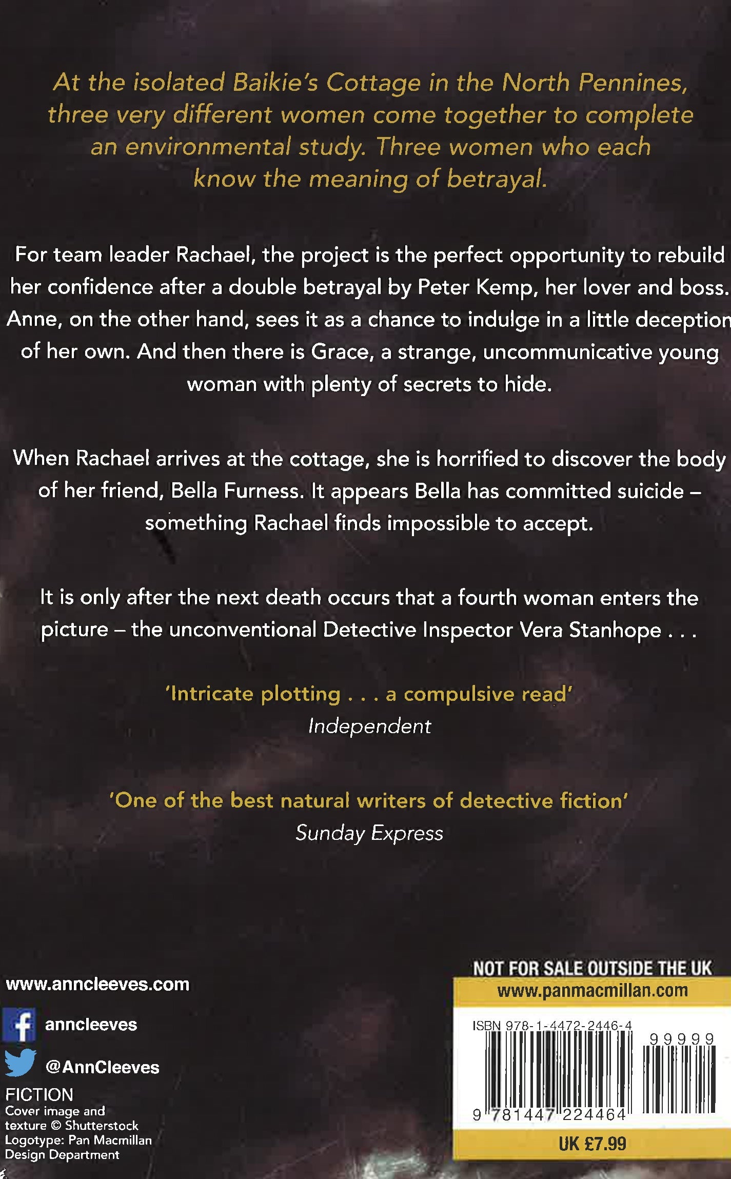 Winner of the 2017 Crime Writers' Association Diamond Dagger. The Crow Trap is the first book in Ann Cleeves' Vera Stanhope series - which is now a major ITV detective drama starring Brenda Blethyn, Vera. Three very different women come together at isolated Baikie's Cottage on the North Pennines, to complete an environmental survey. Three women who each know the meaning of betrayal . . . Rachael, the team leader, is still reeling after a double betrayal by her lover and boss, Peter Kemp. Anne, a botanist, sees the survey as a chance to indulge in a little deception of her own. And then there is Grace, a strange, uncommunicative young woman, hiding plenty of her own secrets. Rachael is the first to arrive at the cottage, where she discovers the body of her friend, Bella Furness. Bella, it appears, has committed suicide - a verdict Rachael refuses to accept. When another death occurs, a fourth woman enters the picture - the unconventional Detective Inspector Vera Stanhope . . . Enjoy more of Vera Stanhope's investigations with Telling Tales, Hidden Depths, Silent Voices, The Glass Room, Harbour Street, The Moth Catcher, and The Seagull.