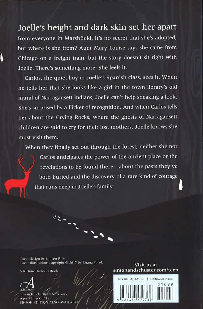 Joelle’s height and dark skin set her apart from everyone in Marshfield. It’s no secret that she’s adopted, but where is she from? Aunt Mary Louise says she came from Chicago on a freight train, but the story doesn’t sit right with Joelle. There’s something more. She feels it.Carlos, the quiet boy in Joelle’s Spanish class, sees it. When he tells her that she looks like a girl in the town library’s old mural of Narragansett Indians, Joelle can’t help sneaking a look. She’s surprised by a flicker of recognition. And when Carlos tells her about the Crying Rocks, where the ghosts of Narragansett children are said to cry for their lost mothers, Joelle knows she must visit them.When they finally set out through the forest, neither she nor Carlos anticipates the power of the ancient place, or the revelations to be found there - about the pasts they’ve both buried, and the discovery of a rare kind of courage that runs deep in Joelle’s family.