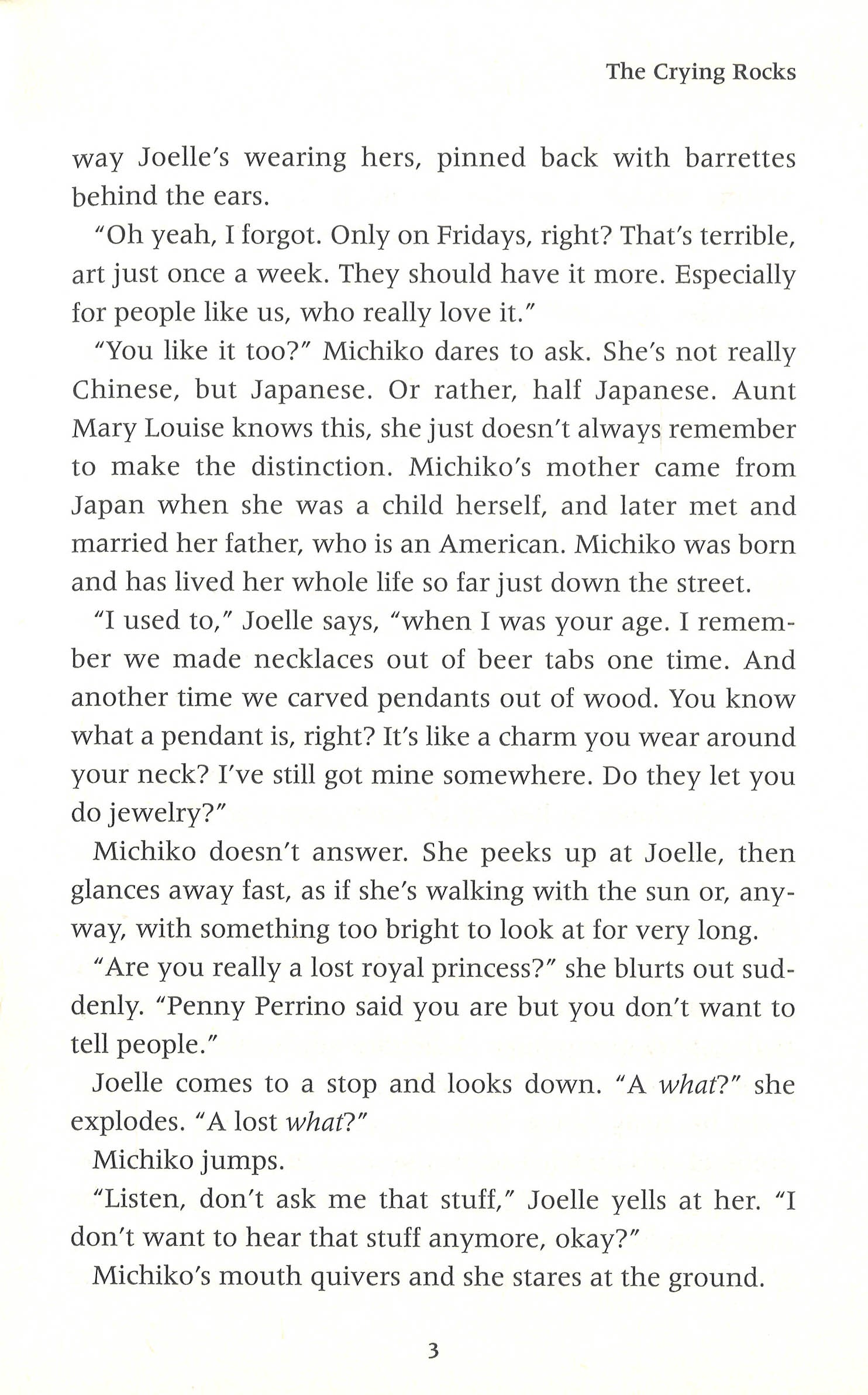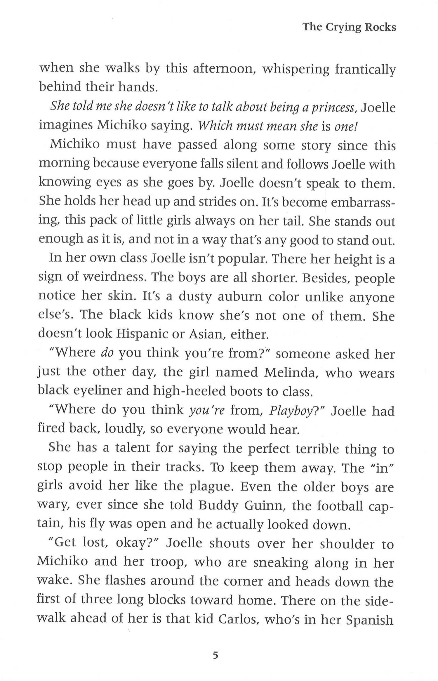 Carlos, the quiet boy in Joelle’s Spanish class, sees it. When he tells her that she looks like a girl in the town library’s old mural of Narragansett Indians, Joelle can’t help sneaking a look. She’s surprised by a flicker of recognition. And when Carlos tells her about the Crying Rocks, where the ghosts of Narragansett children are said to cry for their lost mothers, Joelle knows she must visit them.