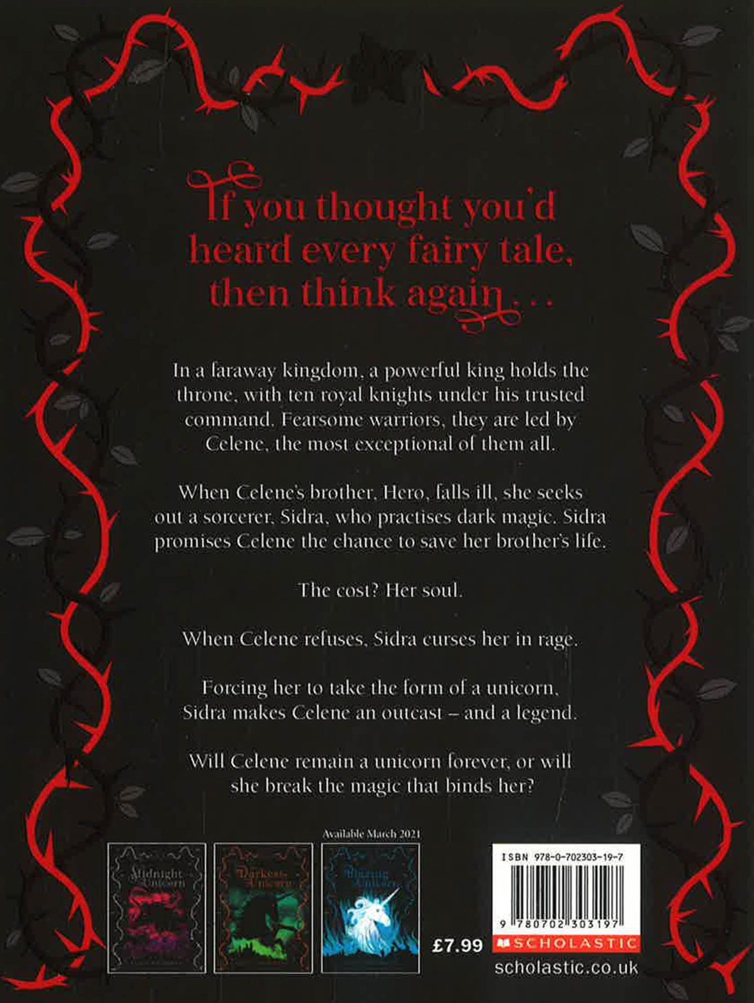 From Alice Hemming, the bestselling author of The Midnight Unicorn, comes a brand-new unicorn fairytale. In the faraway kingdom of Elithia, a powerful king holds the throne, with ten Royal Knights under his trusted command. Fearsome warriors and talented fighters, the knights are led by Celene, the most exceptional of them all. Celene's brother, Hero, also works for the king, and his role as the king's advisor gives him a privilege unrivalled by most. So when he falls ill, the king sends for the wisest healers in the kingdoms. Many healers answer his call, but none are able to discover the reason for Hero's failing health. In desperation, Celene seeks out a sorcerer called Cidra who practices dark magic. Cidra promises Celene the chance to save her brother's life. The cost? Her soul. When Celene refuses, Cidra curses her in rage. Weaving her magic, she forces Celene to take the form of a unicorn. Celene becomes an outcast-and a legend: the Cursed Unicorn becomes well-known in the surrounding kingdoms, though where the unicorn came from nobody could say. Will Celene remain a unicorn forever, or will she break the magic that traps her? Her story started once upon a time, but who knows how it will end... Enchanting dark fairy tales with magical unicorns, fearsome villains and inspiring heroines Perfect for fans of SKANDAR AND THE UNICORN THIEF Great for people who love fairy tales, Disney and unicorns DARK UNICORNS - COLLECT THEM ALL! The Midnight Unicorn Paperback eBook The Darkest Unicorn Paperback eBook The Cursed Unicorn Paperback eBook The Blazing Unicorn Paperback eBook Coming Soon: The Frozen Unicorn Paperback eBook