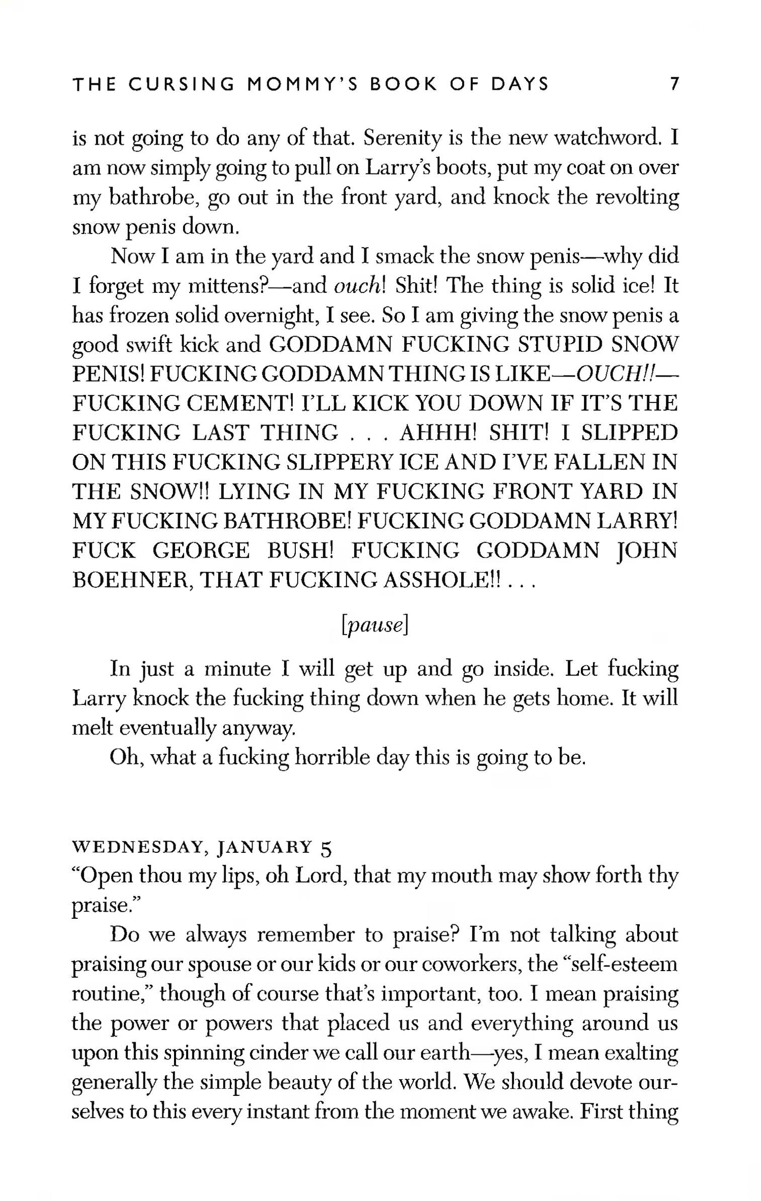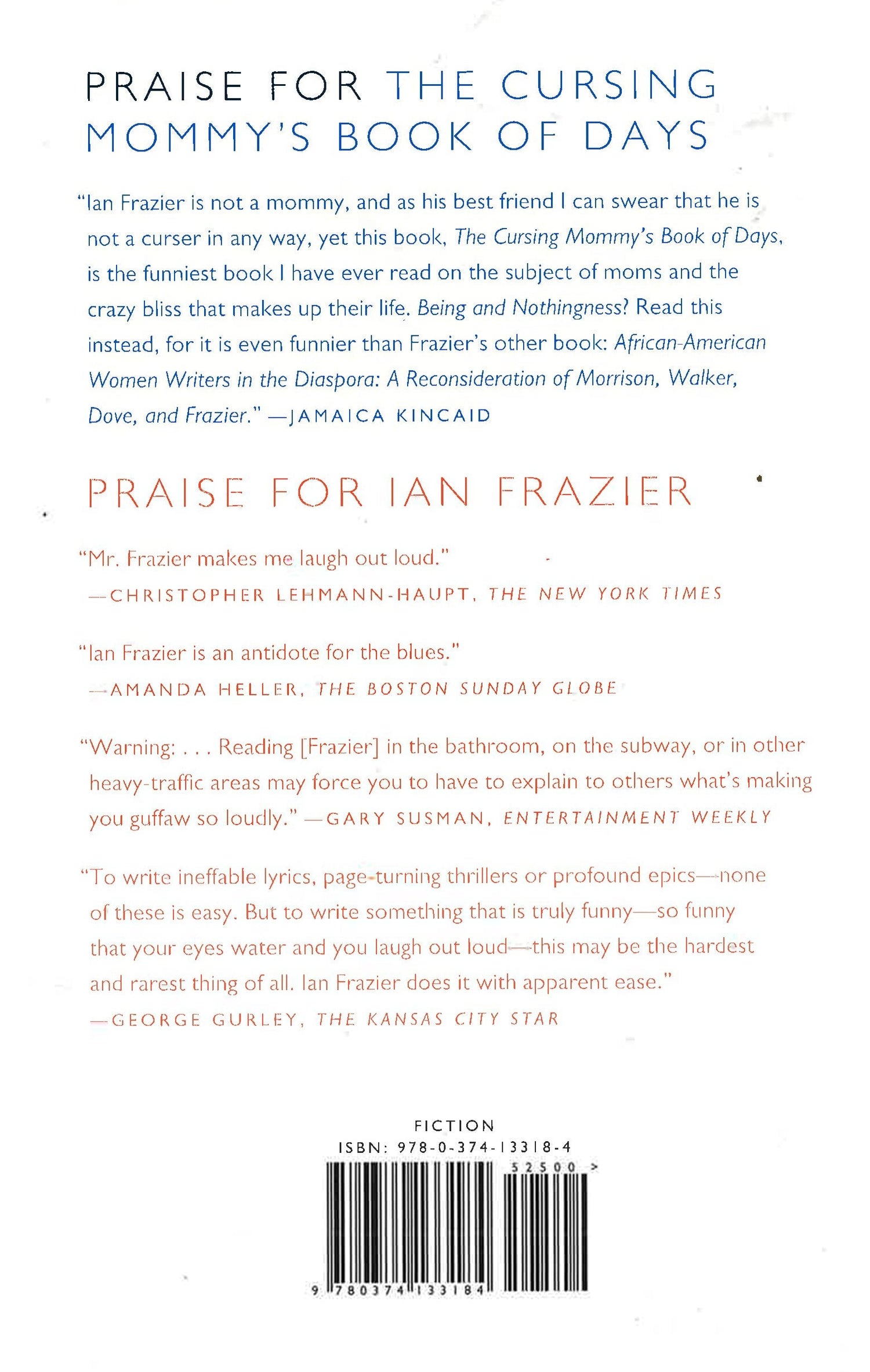 Based on his widely read columns for The New Yorker, Ian Frazier's uproarious first novel, The Cursing Mommy's Book of Days, centers on a profoundly memorable character, sprung from an impressively fertile imagination. Structured as a daybook of sorts, the book follows the Cursing Mommy?beleaguered wife of Larry and mother of two boys, twelve and eight?as she tries (more or less) valiantly to offer tips on how to do various tasks around the home, only to end up on the ground, cursing, surrounded by broken glass. Her voice is somewhere between Phyllis Diller's and Sylvia Plath's: a hilariously desperate housewife with a taste for swearing and large glasses of red wine, who speaks to the frustrations of everyday life. Frazier has demonstrated an astonishing ability to operate with ease in a variety of registers: from On the Rez, an investigation into the lives of modern day Oglala Sioux written with a mix of humor, compassion, and imagination, to Dating Your Mom, a sidesplitting collection of humorous essays that imagines, among other things, how and why you might begin a romance with your mother. Here, Frazier tackles another genre with his usual grace and aplomb, as well as an extra helping of his trademark wicked wit. The Cursing Mommy's failures and weaknesses are our own?and Frazier gives them a loving, satirical spin that is uniquely his own. * This book may have remainder mark and minor shelfwear*