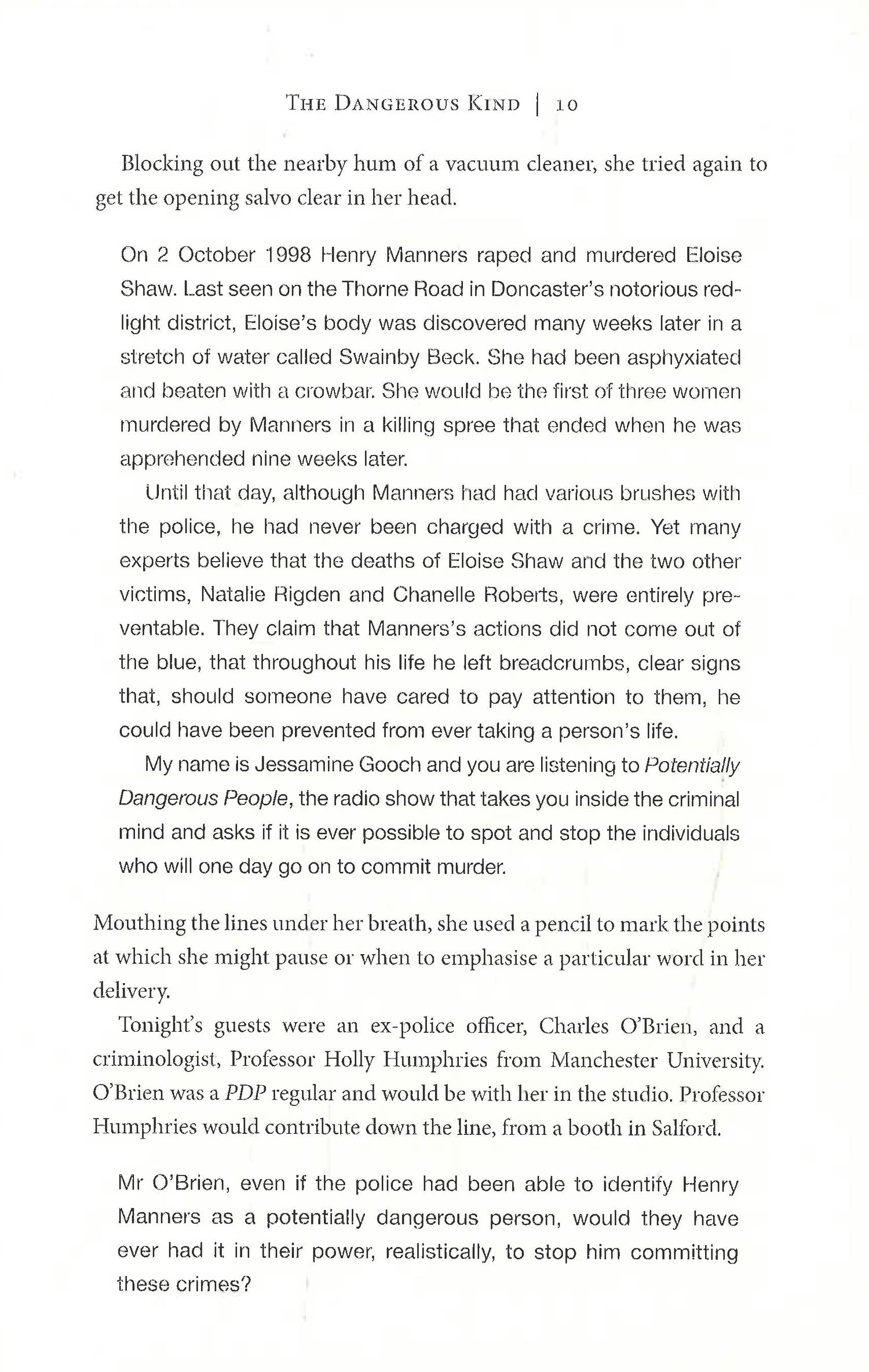 Perfect for fans of The Silent Patient and He Said/She Said. What if the people you trust are the ones you should fear most? We all recognise them: those who send prickles up the back of our necks. The charmers, the liars, the manipulators. Those who have the potential to go that one step too far. Each week Jessamine Gooch broadcasts a radio show about convicted killers. But when she is approached for help in solving a current case, around a troubled missing woman, she faiis to realise there is a dark figure closer to home, one that threatens the safety of her own family . . . Relentlessly gripping, The Dangerous Kind is a thriller that will make you second-guess everyone you meet. What people are saying about THE DANGEROUS KIND 'Brilliantly compelling' T.M. Logan 'Dark and unpredictable' Jenny Quintana 'One of the best page-turners around' Glamour 'Gritty, gripping and timely' Heat 'Searingly relevant' Gillian McAllister 'Dark, uncompromising but full of heart. It gave me goosebumps' Holly Seddon 'Tense right from the first pitch black scene' Amy Lloyd 'Great concept, silky prose & originality oozing off every page' Eva Dolan 'Absolutely brilliant . . . a really sophisticated, smart, engaging thriller' Jo Spain 'Dark, disturbing, devilishly plotted' Chris Whitaker 'Terrifyingly plausible . . . One of the thrillers of the year' Martyn Waites