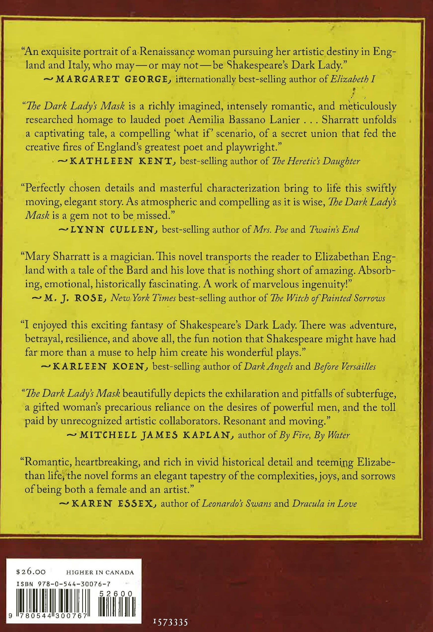 London, 1593. Aemilia Bassano Lanier is beautiful and accomplished, but her societal conformity ends there. She frequently cross-dresses to escape her loveless marriage and to gain freedoms only men enjoy, but a chance encounter with a ragged, little-known poet named Shakespeare changes everything. Aemilia grabs at the chance to pursue her long-held dream of writing and the two outsiders strike up a literary bargain. They leave plague-ridden London for Italy, where they begin secretly writing comedies together and where Will falls in love with the beautiful country -- and with Aemilia, his Dark Lady. Their Italian idyll, though, cannot last and their collaborative affair comes to a devastating end. Will gains fame and fortune for their plays back in London and years later publishes the sonnets mocking his former muse. Not one to stand by in humiliation, Aemilia takes up her own pen in her defense and in defense of all women. The Dark Lady's Mask gives voice to a real Renaissance woman in every sense of the word.