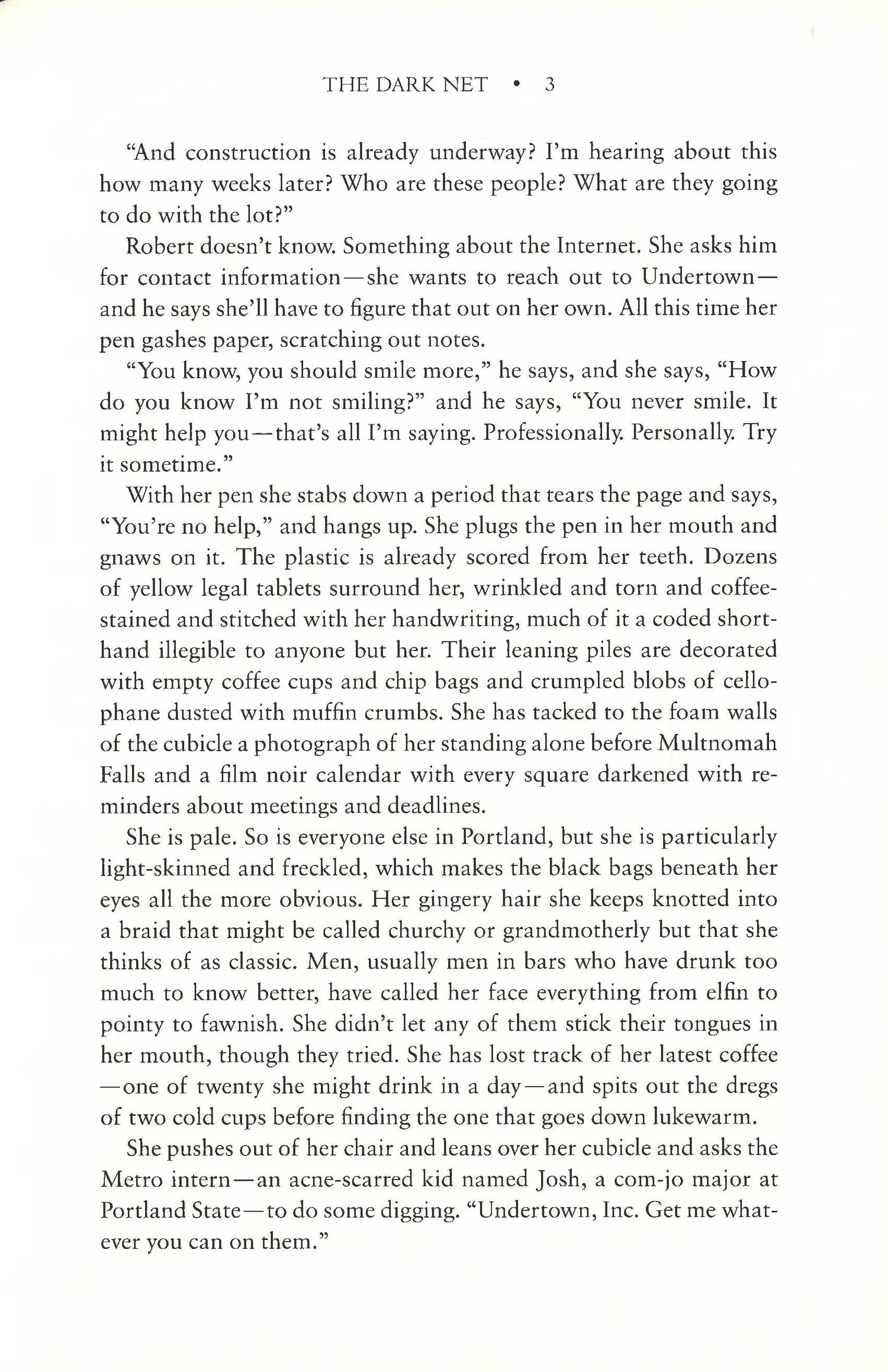 An anonymous and often criminal arena that exists in the secret far reaches of the Web, some use it to manage Bitcoins, pirate movies and music, or traffic in drugs and stolen goods. And now an ancient darkness is gathering there as well. This force is threatening to spread virally into the real world unless it can be stopped by members of a ragtag crew: Twelve-year-old Hannah -- who has been fitted with the Mirage, a high-tech visual prosthetic to combat her blindness-- wonders why she sees shadows surrounding some people. Lela, a technophobic journalist, has stumbled upon a story nobody wants her to uncover. Mike Juniper, a one-time child evangelist who suffers from personal and literal demons, has an arsenal of weapons stored in the basement of the homeless shelter he runs. And Derek, a hacker with a cause, believes himself a soldier of the Internet, part of a cyber army akin to Anonymous. They have no idea what the Dark Net really contains. Set in present-day Portland, The Dark Net is a cracked-mirror version of the digital nightmare we already live in, a timely and wildly imaginative techno-thriller about the evil that lurks in real and virtual spaces, and the power of a united few to fight back.